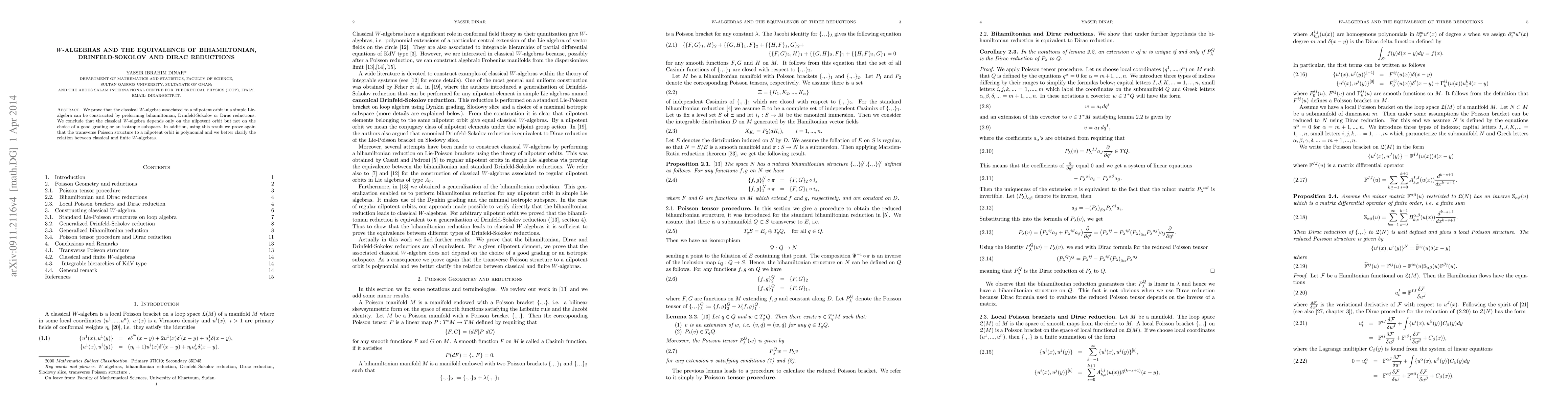 This paper demonstrates the equivalence of bihamiltonian, Drinfeld-Sokolov, and Dirac reductions in constructing classical $W$-algebras associated with nilpotent orbits in simple Lie algebras. It concludes that these $W$-algebras depend solely on the nilpotent orbit, not on the specific grading or subspace choice.