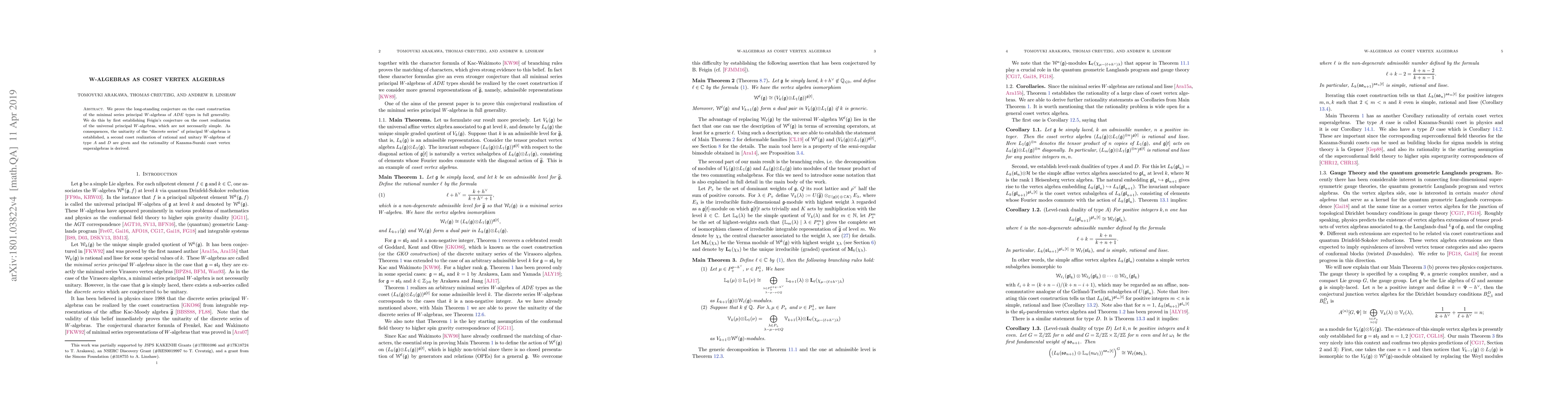 This paper proves the conjecture on the coset construction of minimal series principal $W$-algebras for $ADE$ types, establishing Feigin's conjecture on coset realizations of universal principal $W$-algebras. The results include the unitarity of discrete series, second coset realizations for $W$-algebras of type $A$ and $D$, and the rationality of Kazama-Suzuki coset vertex superalgebras.