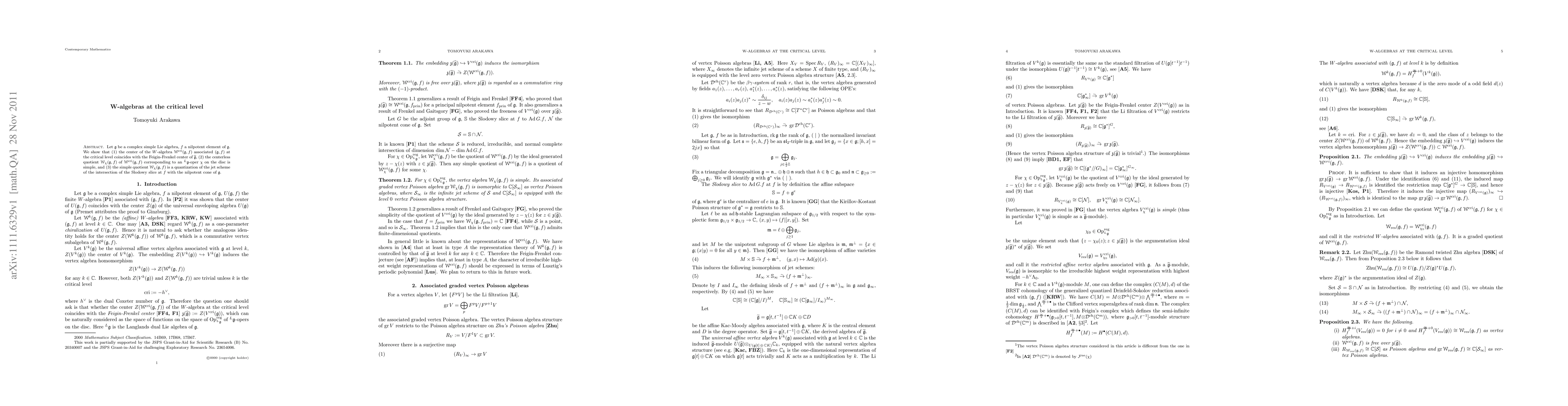 Let g be a complex simple Lie algebra, f a nilpotent element of g. We show that (1) the center of the W-algebra $W^{cri}(g,f)$ associated with (g,f) at the critical level coincides with the Feigin-Frenkel center of the affine Lie algebra associated with g, (2) the centerless quotient $W_{\chi}(g,f)$ of $W^{cri}(g,f)$ corresponding to an oper $\chi$ on the disc is simple, (3) the simple quotient $W_{\chi}(g,f)$ is a quantization of the jet scheme of the intersection of the Slodowy slice at f with the nilpotent cone of g.