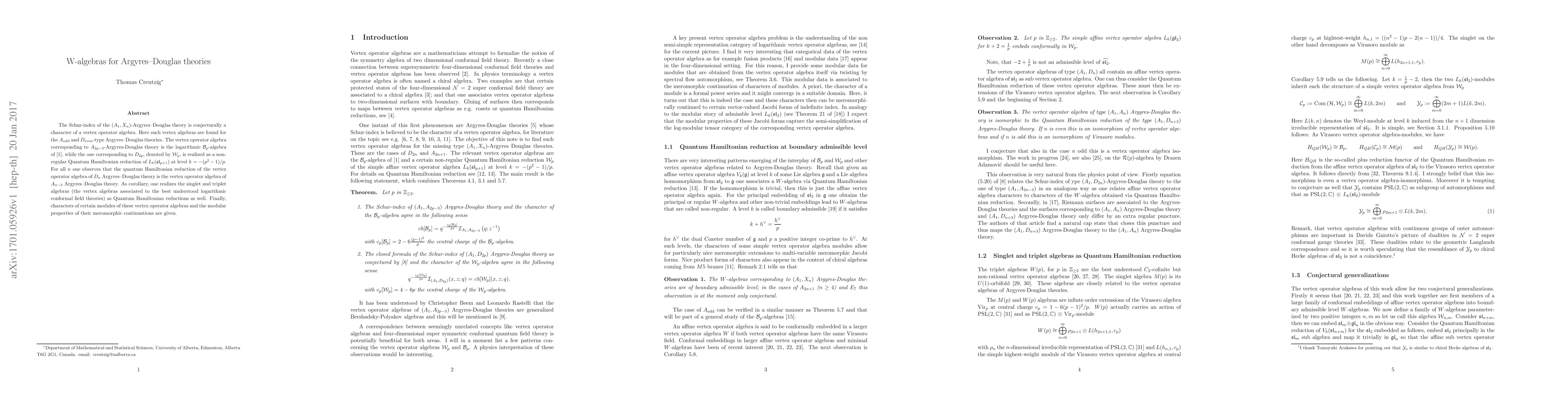 The Schur-index of the $(A_1, X_n)$-Argyres-Douglas theory is conjecturally a character of a vertex operator algebra. Here such vertex algebras are found for the $A_{\text{odd}}$ and $D_{\text{even}}$-type Argyres-Douglas theories. The vertex operator algebra corresponding to $A_{2p-3}$-Argyres-Douglas theory is the logarithmic $\mathcal B_p$-algebra of [1], while the one corresponding to $D_{2p}$, denoted by $\mathcal W_p$, is realized as a non-regular Quantum Hamiltonian reduction of $L_{k}(\mathfrak{sl}_{p+1})$ at level $k=-(p^2-1)/p$. For all $n$ one observes that the quantum Hamiltonian reduction of the vertex operator algebra of $D_n$ Argyres-Douglas theory is the vertex operator algebra of $A_{n-3}$ Argyres-Douglas theory. As corollary, one realizes the singlet and triplet algebras (the vertex algebras associated to the best understood logarithmic conformal field theories) as Quantum Hamiltonian reductions as well. Finally, characters of certain modules of these vertex operator algebras and the modular properties of their meromorphic continuations are given.
