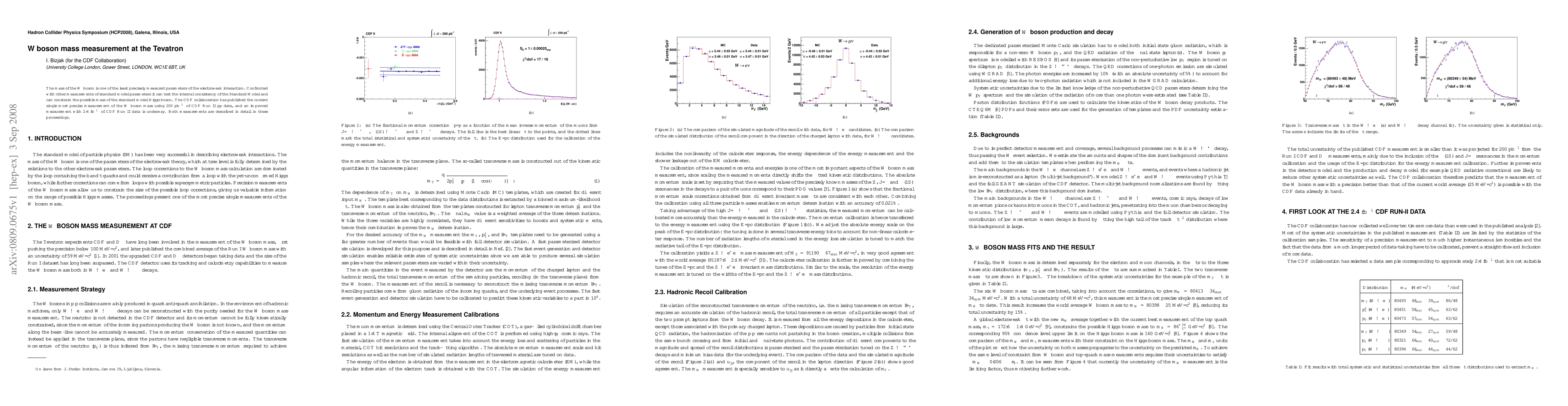 The CDF collaboration has reported the most precise measurement of the W boson mass using Tevatron data, which tests the Standard Model's internal consistency and constrains the Higgs boson's mass. An improved measurement with larger data sets is in progress.