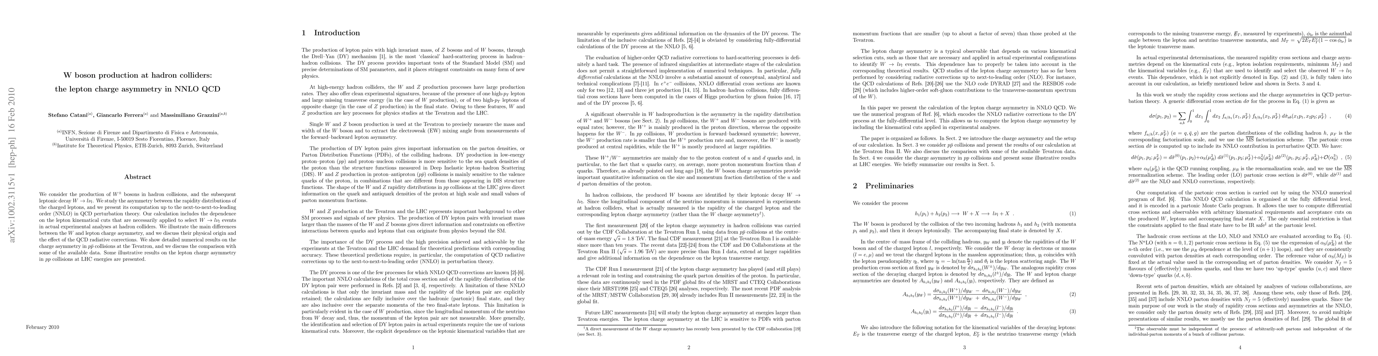 This paper computes the lepton charge asymmetry in W boson production at hadron colliders up to next-to-next-to-leading order (NNLO) in QCD, analyzing the differences between W and lepton charge asymmetries and discussing their physical origins and QCD radiative corrections. Numerical results for the Tevatron and illustrative results for the LHC are provided.