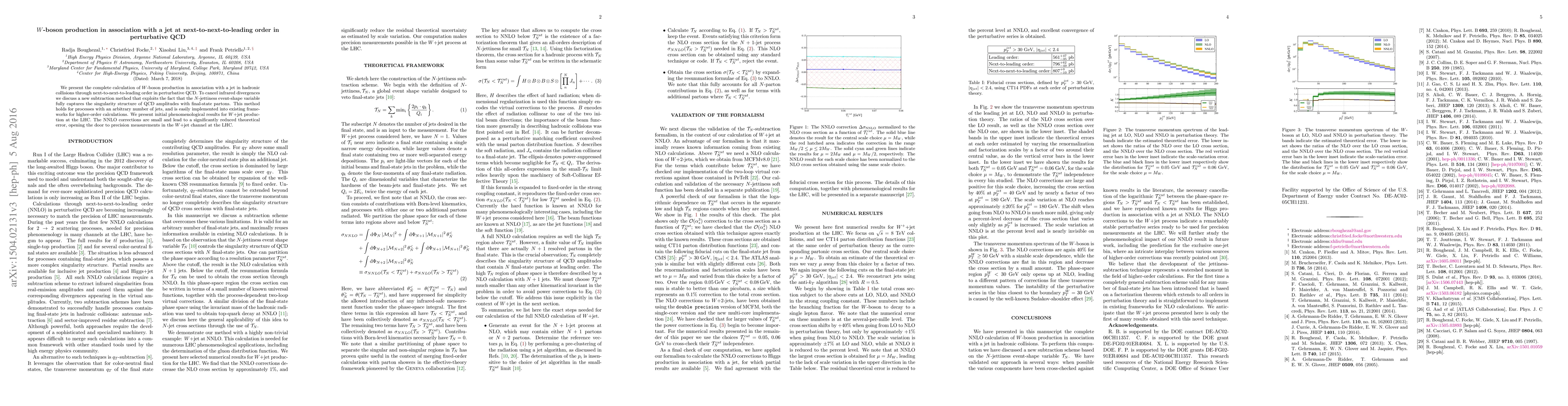 This paper presents the complete next-to-next-to-leading order (NNLO) calculation for $W$-boson production with a jet in hadronic collisions, employing a new infrared divergence subtraction method based on the $N$-jettiness variable. The NNLO corrections are small, significantly reducing theoretical error and enabling precision measurements in the $W$+jet channel at the LHC.