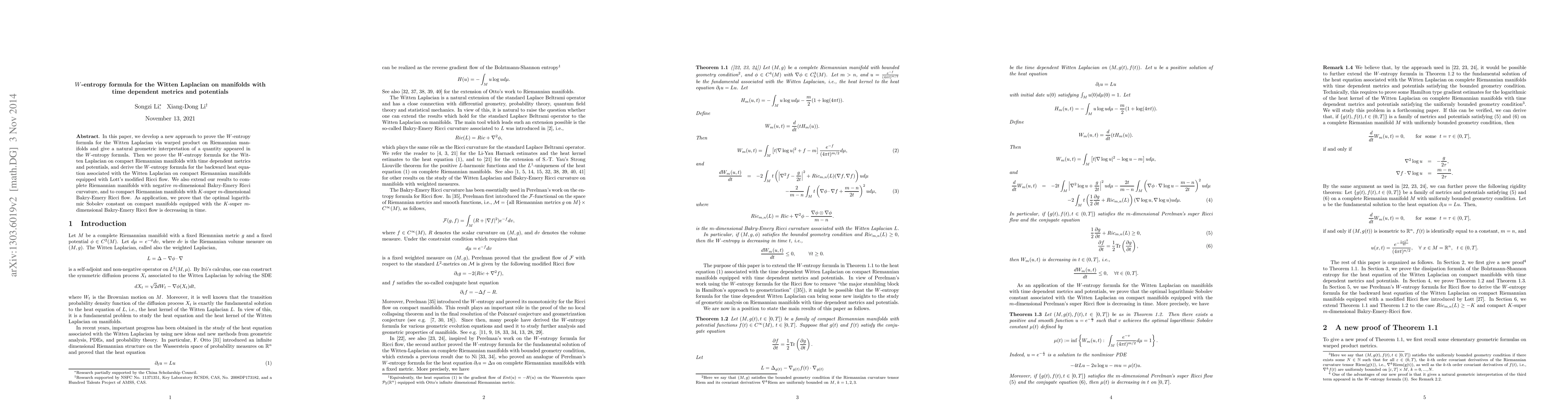 In this paper, we develop a new approach to prove the $W$-entropy formula for the Witten Laplacian via warped product on Riemannian manifolds and give a natural geometric interpretation of a quantity appeared in the $W$-entropy formula. Then we prove the $W$-entropy formula for the Witten Laplacian on compact Riemannian manifolds with time dependent metrics and potentials, and derive the $W$-entropy formula for the backward heat equation associated with the Witten Laplacian on compact Riemannian manifolds equipped with Lott's modified Ricci flow. We also extend our results to complete Riemannian manifolds with negative $m$-dimensional Bakry-Emery Ricci curvature, and to compact Riemannian manifolds with $K$-super $m$-dimensional Bakry-Emery Ricci flow. As application, we prove that the optimal logarithmic Sobolev constant on compact manifolds equipped with the $K$-super $m$-dimensional Bakry-Emery Ricci flow is decreasing in time.