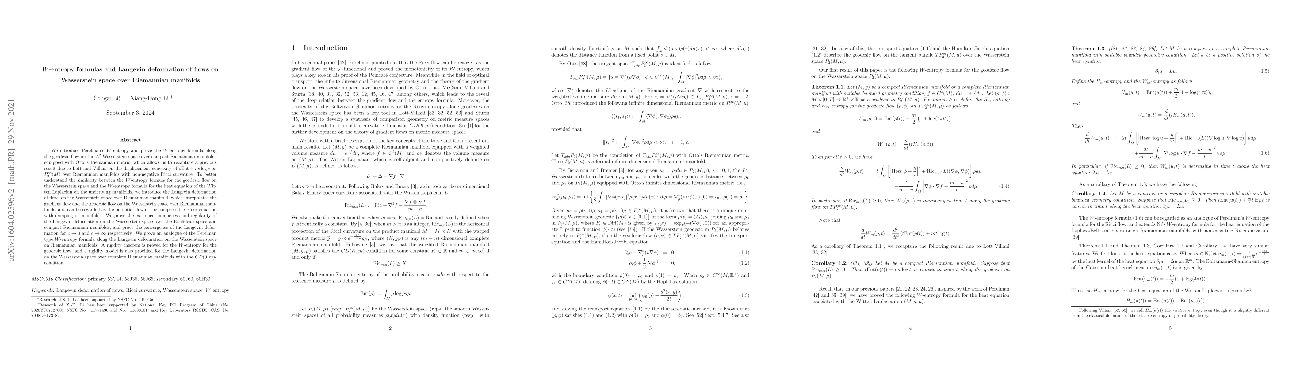 We introduce Perelman's $W$-entropy and prove the $W$-entropy formula along the geodesic flow on the $L^2$-Wasserstein space over compact Riemannian manifolds equipped with Otto's Riemannian metric, which allows us to recapture a previous result due to Lott and Villani on the displacement convexity of $s{\rm Ent}+ns\log s$ on $P^\infty_2(M)$ over Riemannian manifolds with non-negative Ricci curvature. To better understand the similarity between the $W$-entropy formula for the geodesic flow on the Wasserstein space and the $W$-entropy formula for the heat equation of the Witten Laplacian on the underlying manifolds, we introduce the Langevin deformation of flows on the Wasserstein space over Riemannian manifold, which interpolates the gradient flow and the geodesic flow on the Wasserstein space over Riemannian manifolds, and can be regarded as the potential flow of the compressible Euler equation with damping on manifolds. We prove the existence, uniqueness and regularity of the Langevin deformation on the Wasserstein space over the Euclidean space and compact Riemannian manifolds, and prove the convergence of the Langevin deformation for $c\rightarrow 0$ and $c\rightarrow \infty$ respectively. We prove an analogue of the Perelman type $W$-entropy formula along the Langevin deformation on the Wasserstein space on Riemannian manifolds. A rigidity theorem is proved for the $W$-entropy for the geodesic flow, and a rigidity model is also provided for the Langevin deformation on the Wasserstein space over complete Riemannian manifolds with the $CD(0, m)$-condition.