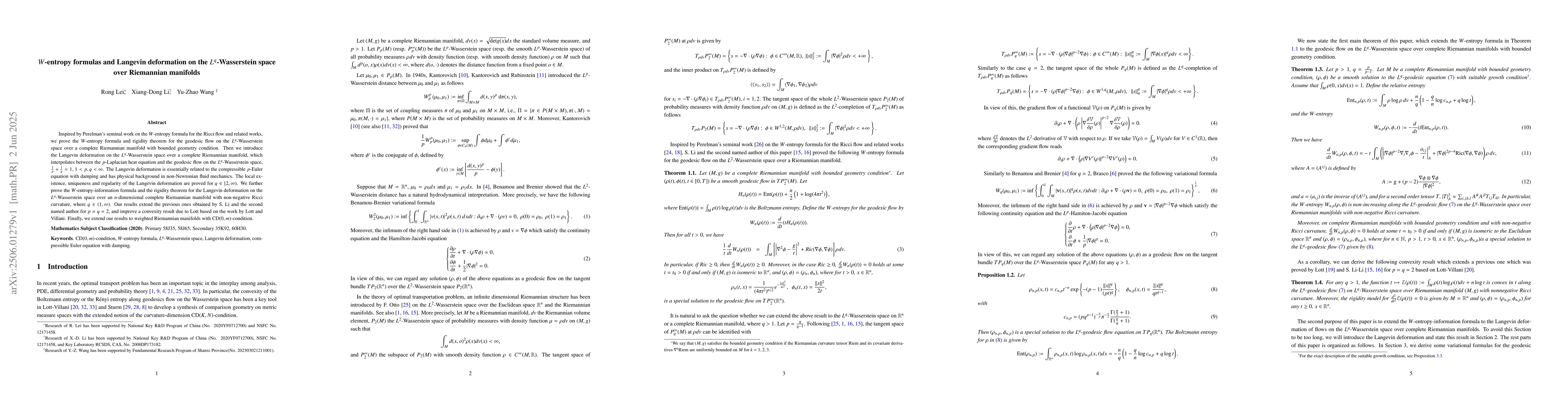 Inspired by Perelman's seminal work on the $W$-entropy formula for the Ricci flow and related works, we prove the $W$-entropy formula and rigidity theorem for the geodesic flow on the $L^q$-Wasserstein space over a complete Riemannian manifold with bounded geometry condition. Then we introduce the Langevin deformation on the $L^q$-Wasserstein space over a complete Riemannian manifold, which interpolates between the $p$-Laplacian heat equation and the geodesic flow on the $L^q$-Wasserstein space, ${1\over p}+{1\over q}=1$, $1< p, q<\infty$. The Langevin deformation is essentially related to the compressible $p$-Euler equation with damping and has physical background in non-Newtonian fluid mechanics. The local existence, uniqueness and regularity of the Langevin deformation are proved for $q\in [2, \infty)$. We further prove the $W$-entropy-information formula and the rigidity theorem for the Langevin deformation on the $L^q$-Wasserstein space over an $n$-dimensional complete Riemannian manifold with non-negative Ricci curvature, where $q\in (1,\infty)$. Our results extend the previous ones obtained by S. Li and the second named author for $p=q=2$, and improve a convexity result due to Lott based on the work by Lott and Villani. Finally, we extend our results to weighted Riemannian manifolds with CD$(0, m)$-condition.