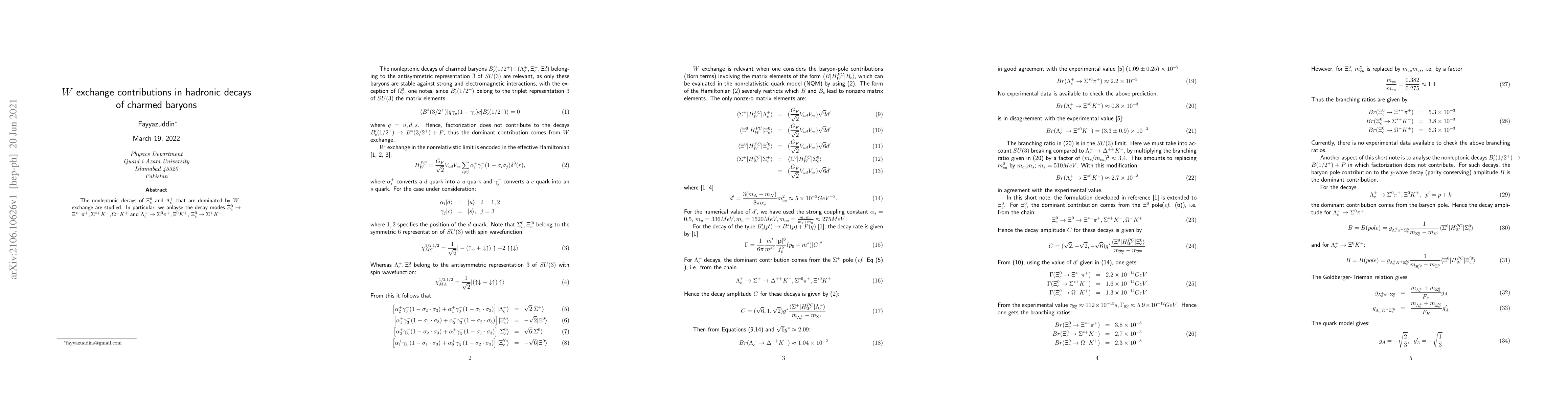The nonleptonic decays of $\Xi_c^0$ and $\Lambda_c^+$ that are dominated by $W$-exchange are studied. In particular, we anlayse the decay modes $\Xi_c^0 \rightarrow \Xi^{*-} \pi^+, \Sigma^{*+}K^-, \Omega^-K^+$ and $\Lambda_c^+\rightarrow \Sigma^0\pi^+, \Xi^0 K^+$, $\Xi^0_c\rightarrow \Sigma^+K^-$.