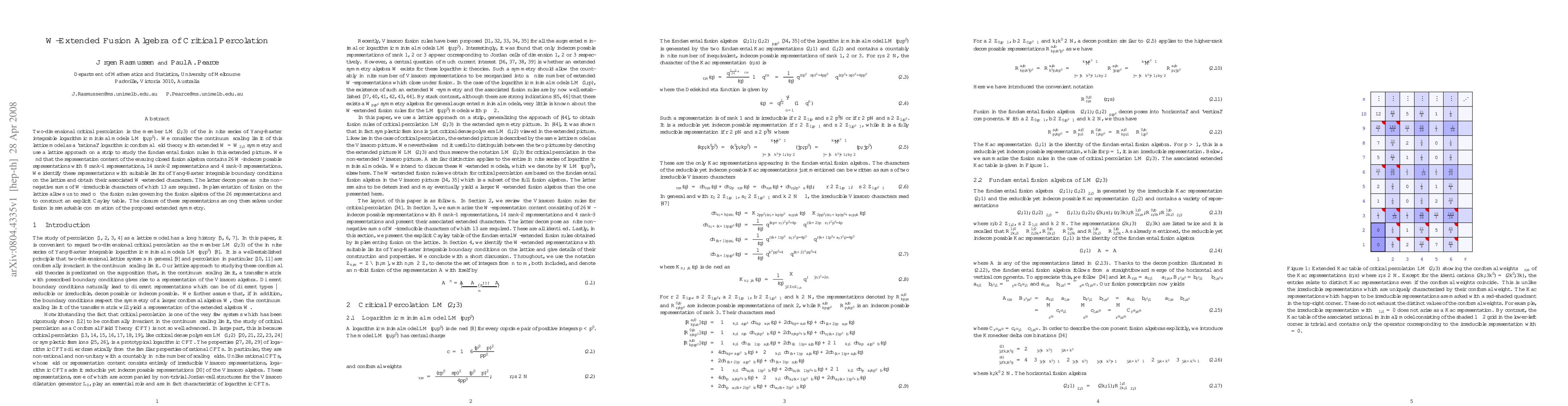 This paper investigates the continuum limit of two-dimensional critical percolation, revealing a W-extended fusion algebra with 26 representations, and constructs an explicit fusion table confirming the extended W=W_{2,3} symmetry. The identified representations correspond to limits of lattice boundary conditions and decompose into 13 W-irreducible characters.