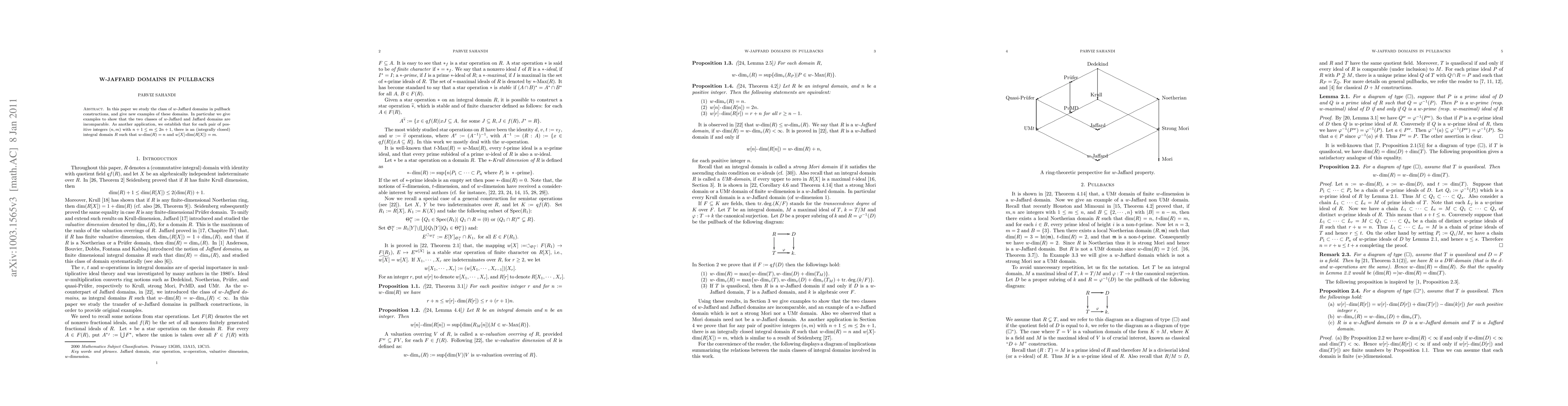 This paper explores the class of $w$-Jaffard domains within pullback constructions, providing new examples and demonstrating the incomparability of $w$-Jaffard and Jaffard domains. It also establishes that for specific pairs $(n,m)$, there exists an integral domain $R$ with $w$-$\dim(R)=n$ and $w[X]$-$\dim(R[X])=m$.