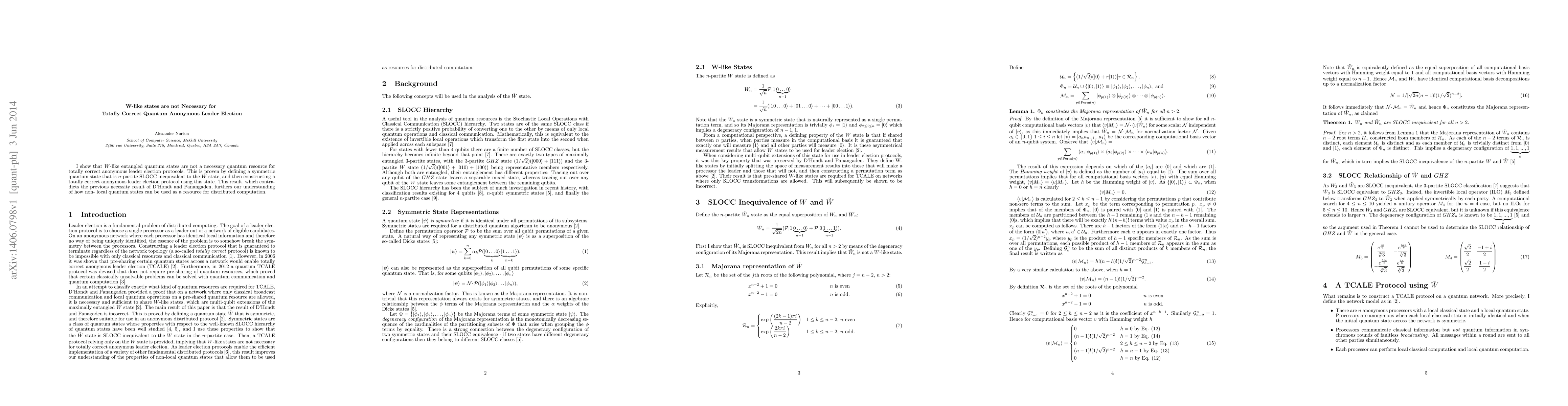 I show that W-like entangled quantum states are not a necessary quantum resource for totally correct anonymous leader election protocols. This is proven by defining a symmetric quantum state that is n-partite SLOCC inequivalent to the W state, and then constructing a totally correct anonymous leader election protocol using this state. This result, which contradicts the previous necessity result of D'Hondt and Panangaden, furthers our understanding of how non-local quantum states can be used as a resource for distributed computation.