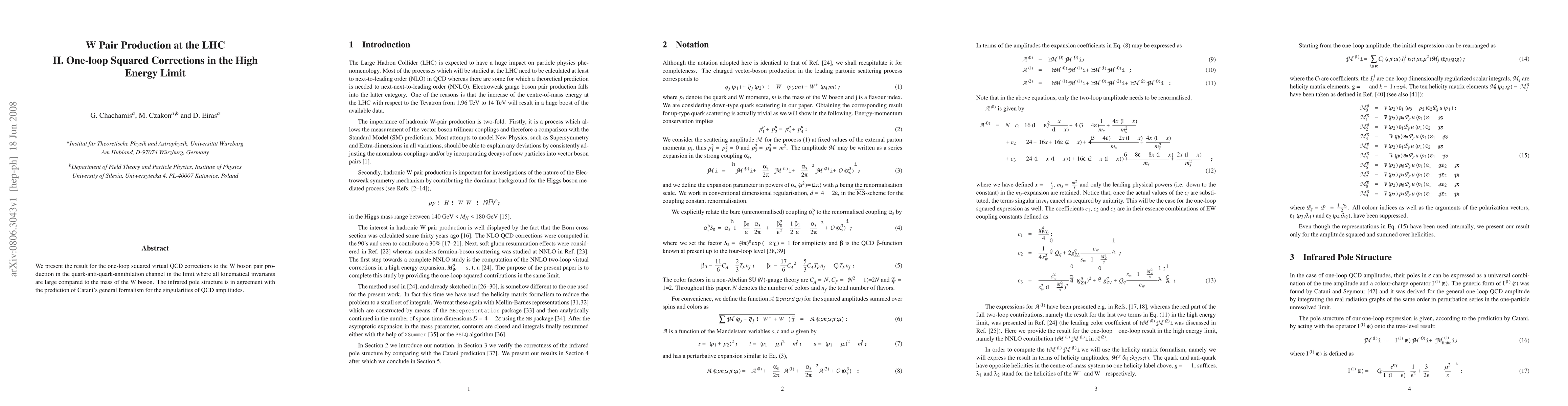 We present the result for the one-loop squared virtual QCD corrections to the W boson pair production in the quark-anti-quark-annihilation channel in the limit where all kinematical invariants are large compared to the mass of the W boson. The infrared pole structure is in agreement with the prediction of Catani's general formalism for the singularities of QCD amplitudes.