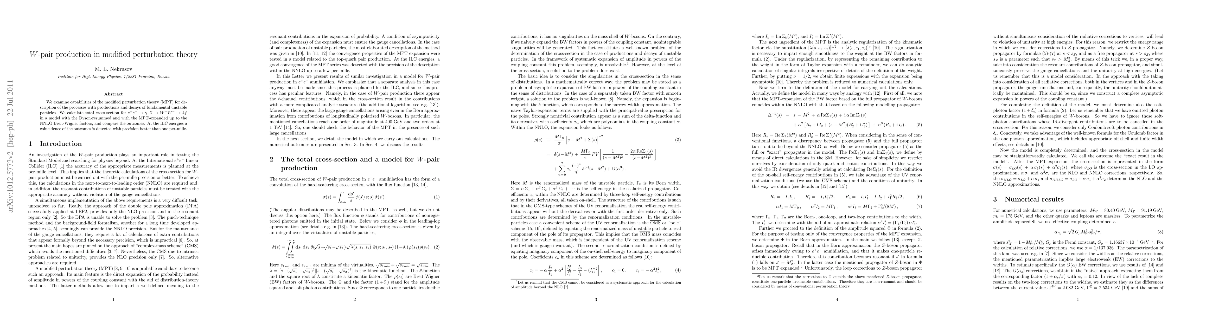 We examine capabilities of the modified perturbation theory (MPT) for description of the processes with productions and decays of fundamental unstable particles. We calculate total cross-section for $e^{+} e^{-} \to \gamma,Z \to W^{+} W^{-} \to 4f$ in a model with the Dyson-resummed and with the MPT-expanded up to the NNLO Breit-Wigner factors, and compare the outcomes. At the ILC energies a coincidence of the outcomes is detected with precision better than one per-mille.