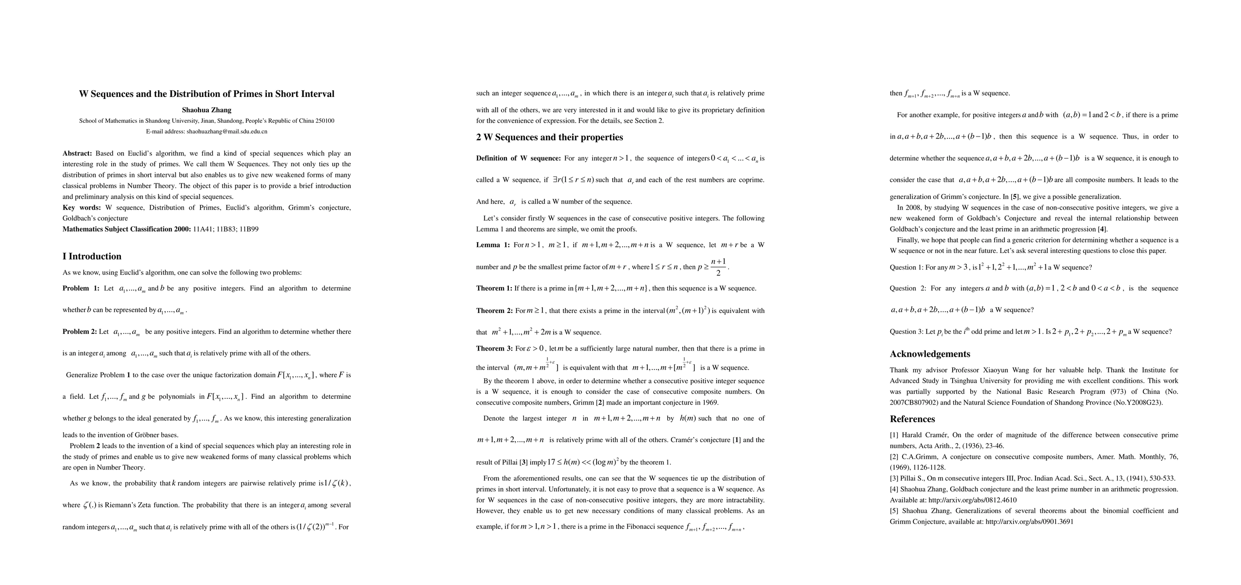 Based on Euclid's algorithm, we find a kind of special sequences which play an interesting role in the study of primes. We call them W Sequences. They not only ties up the distribution of primes in short interval but also enables us to give new weakened forms of many classical problems in Number Theory. The object of this paper is to provide a brief introduction and preliminary analysis on this kind of special sequences.