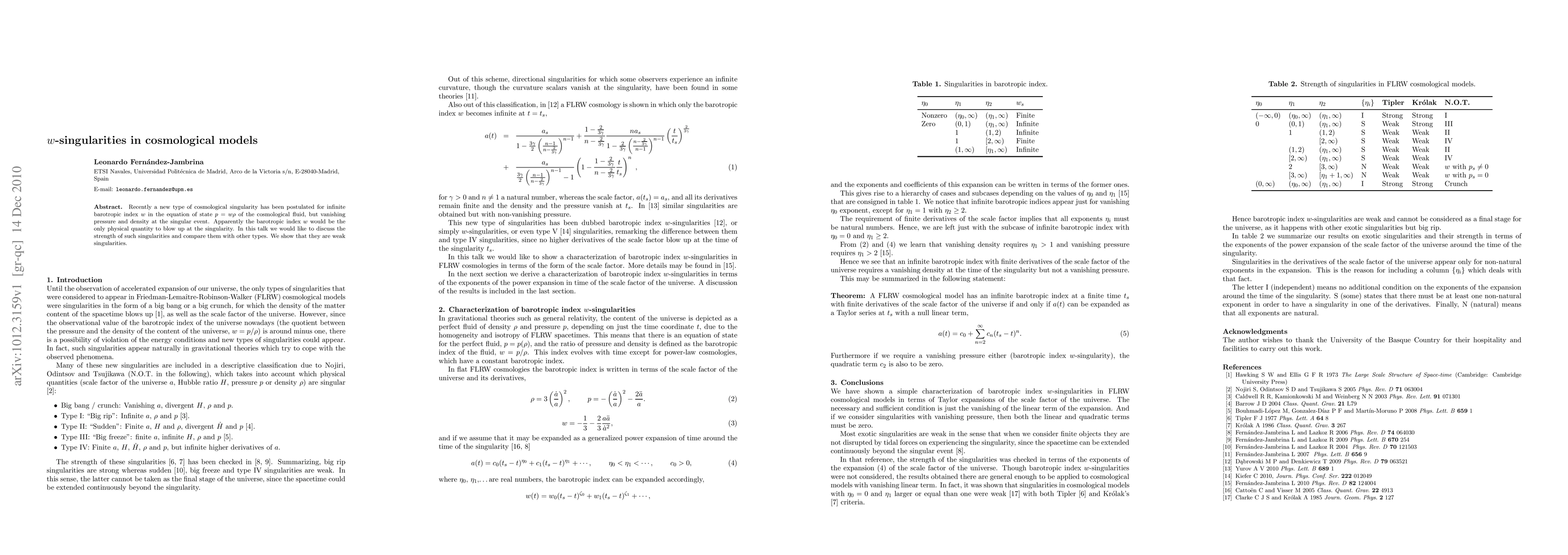 The paper introduces $w$-singularities in cosmological models for infinite barotropic index $w$, where pressure and density vanish at the singularity. It is demonstrated that these are weak singularities, distinguishing them from other types and evaluating their strength.