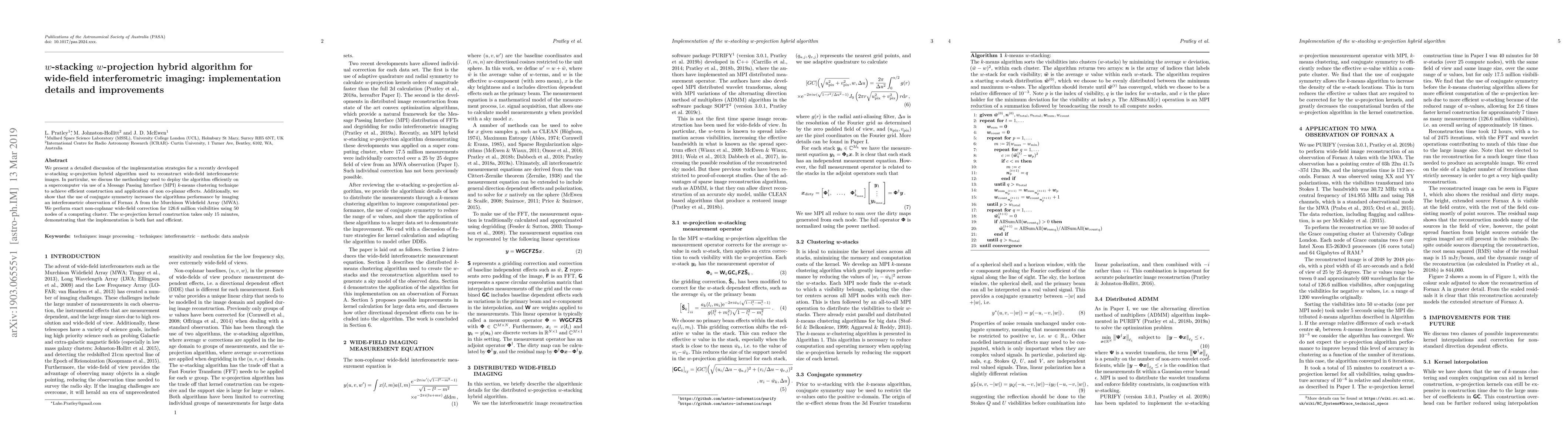 This paper details the implementation of a $w$-stacking $w$-projection hybrid algorithm for reconstructing wide-field interferometric images, utilizing MPI $k$-means clustering for efficient computation on supercomputers. The algorithm's performance is enhanced by employing conjugate symmetry, as demonstrated through imaging Fornax A using the Murchison Widefield Array.