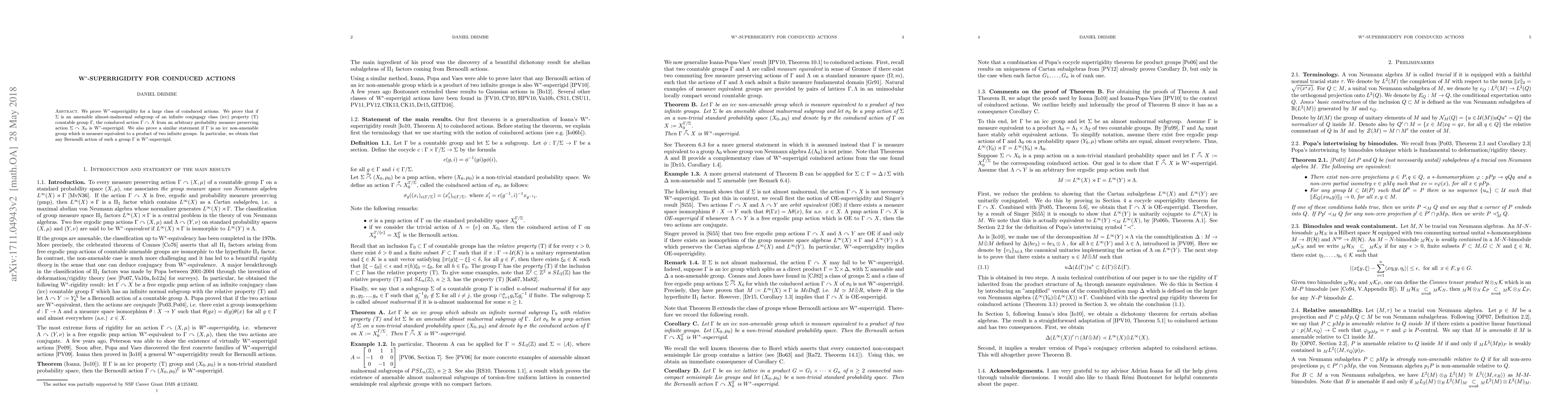 This paper establishes W$^*$-superrigidity for coinduced actions of certain groups, showing that if $\Sigma$ is an amenable almost-malnormal subgroup of an infinite conjugacy class property (T) group $\Gamma$, the coinduced action $\Gamma\curvearrowright X$ retains this rigidity. It also extends this result to icc non-amenable groups equivalent to a product of two infinite groups, proving Bernoulli actions' W$^*$-superrigidity.