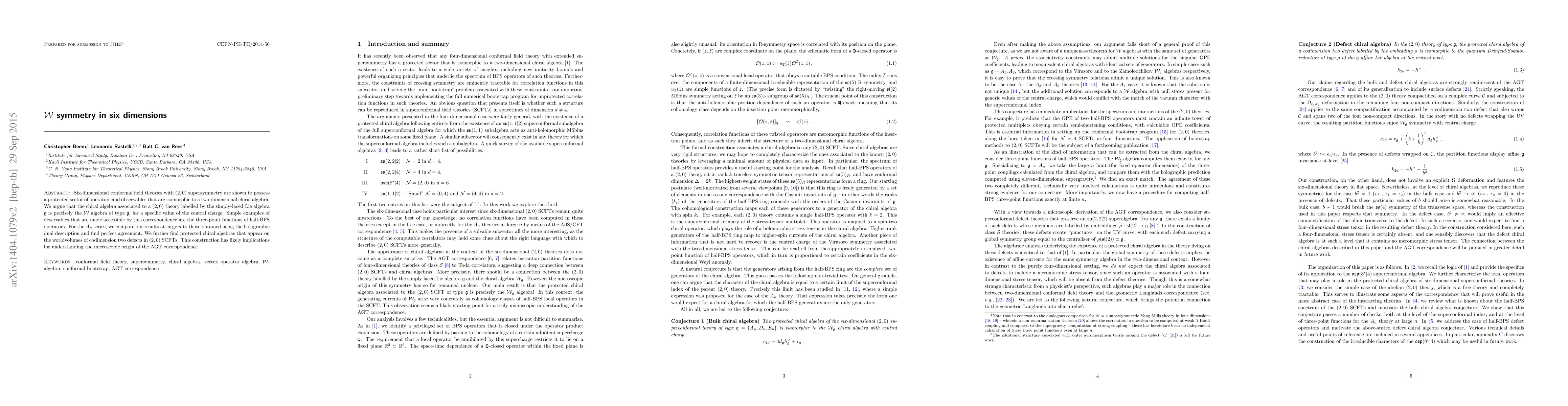 Six-dimensional conformal field theories with $(2,0)$ supersymmetry are shown to possess a protected sector of operators and observables that are isomorphic to a two-dimensional chiral algebra. We argue that the chiral algebra associated to a $(2,0)$ theory labelled by the simply-laced Lie algebra $\mathfrak{g}$ is precisely the W algebra of type $\mathfrak{g}$, for a specific value of the central charge. Simple examples of observables that are made accessible by this correspondence are the three-point functions of half-BPS operators. For the $A_n$ series, we compare our results at large $n$ to those obtained using the holographic dual description and find perfect agreement. We further find protected chiral algebras that appear on the worldvolumes of codimension two defects in $(2,0)$ SCFTs. This construction has likely implications for understanding the microscopic origin of the AGT correspondence.