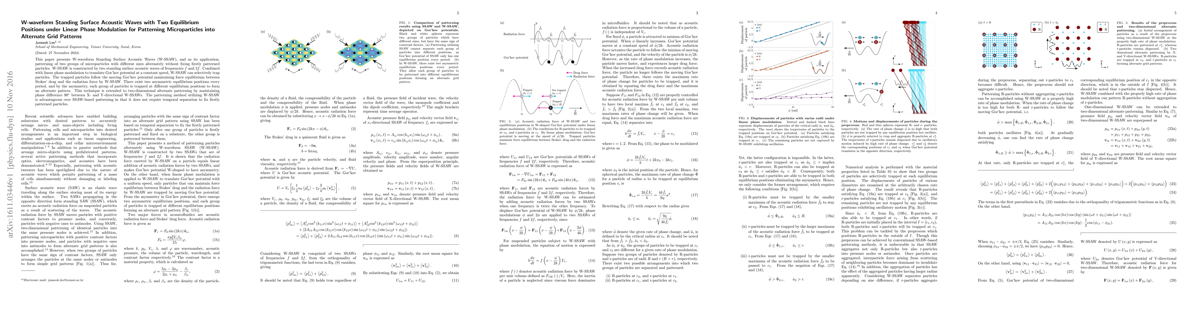 This paper introduces W-waveform Standing Surface Acoustic Waves (W-SSAW) for patterning microparticles into alternate grid patterns without fixing pre-patterned particles. The technique leverages linear phase modulation to create two asymmetric equilibrium positions, enabling selective trapping of different-sized particles in an alternating pattern.
