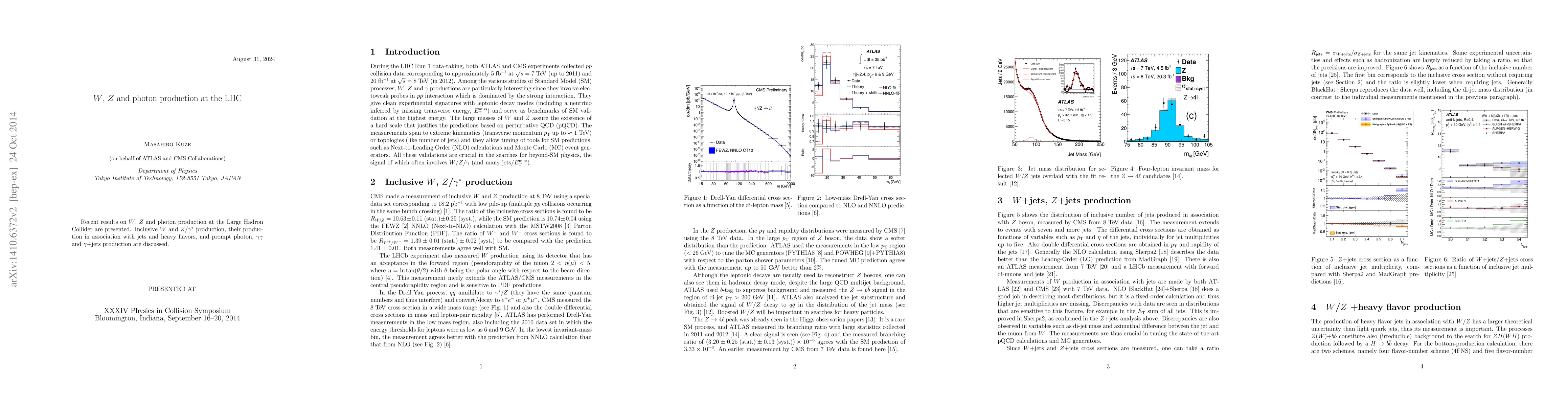 This paper presents recent findings on the production of W, Z bosons, and photons at the Large Hadron Collider, including inclusive production, associations with jets and heavy flavors, and specific processes like prompt photon, diphoton, and photon+jet events.