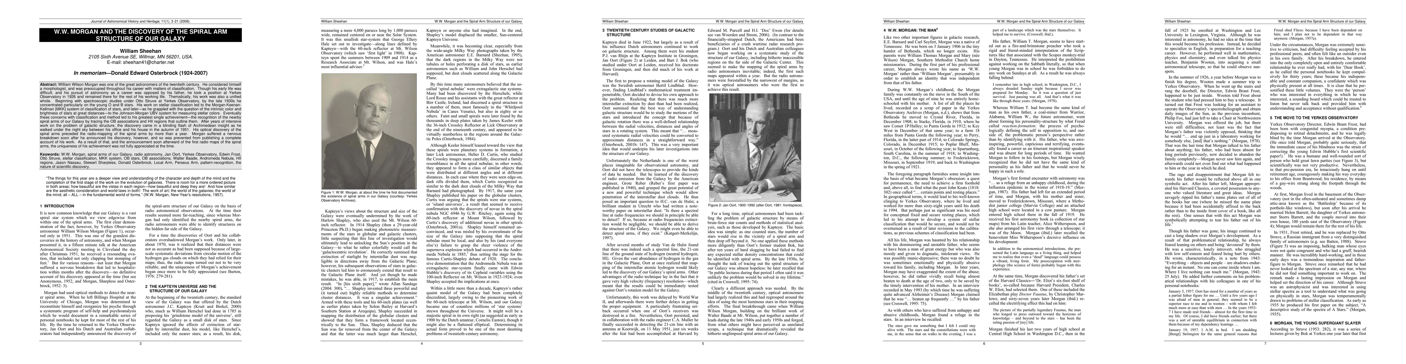 William Wilson Morgan was one of the great astronomers of the twentieth century. He considered himself a morphologist, and was preoccupied throughout his career with matters of classification. Though his early life was difficult, and his pursuit of astronomy as a career was opposed by his father, he took a position at Yerkes Observatory in 1926 and remained there for the rest of his working life. Thematically, his work was also a unified whole. Beginning with spectroscopic studies under Otto Struve at Yerkes Observatory, by the late 1930s he concentrated particularly on the young O and B stars. His work on stellar classification led to the Morgan-Keenan- Kellman [MKK] system of classification of stars, and later - as he grappled with the question of the intrinsic color and brightness of stars at great distances - to the Johnson-Morgan UBV system for measuring stellar colors. Eventually these concerns with classification and method led to his greatest single achievement - the recognition of the nearby spiral arms of our Galaxy by tracing the OB associations and HII regions that outline them. After years of intensive work on the problem of galactic structure, the discovery came in a blinding flash of Archimedean insight as he walked under the night sky between his office and his house in the autumn of 1951. His optical discovery of the spiral arms preceded the radio-mapping of the spiral arms by more than a year. Morgan suffered a nervous breakdown soon after he announced his discovery, however, and so was prevented from publishing a complete account of his work. As a result of that, and the announcement soon afterward of the first radio maps of the spiral arms, the uniqueness of his achievement was not fully appreciated at the time.