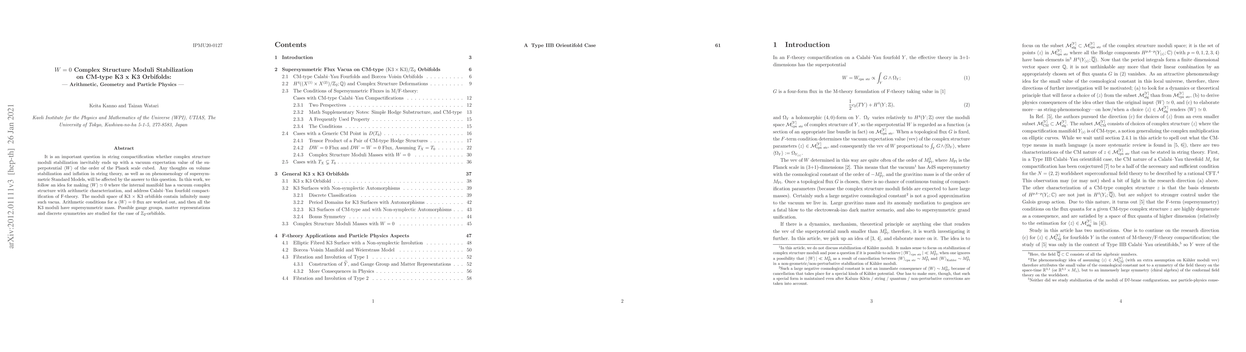 This paper explores the stabilization of complex structure moduli in K3 x K3 orbifolds to achieve a vacuum expectation value of the superpotential W ≈ 0, addressing implications for volume stabilization, inflation, and supersymmetric Standard Models within string theory. It studies the arithmetic and geometric conditions for W=0 flux stabilization and examines potential gauge groups and matter representations for Z_2-orbifolds.