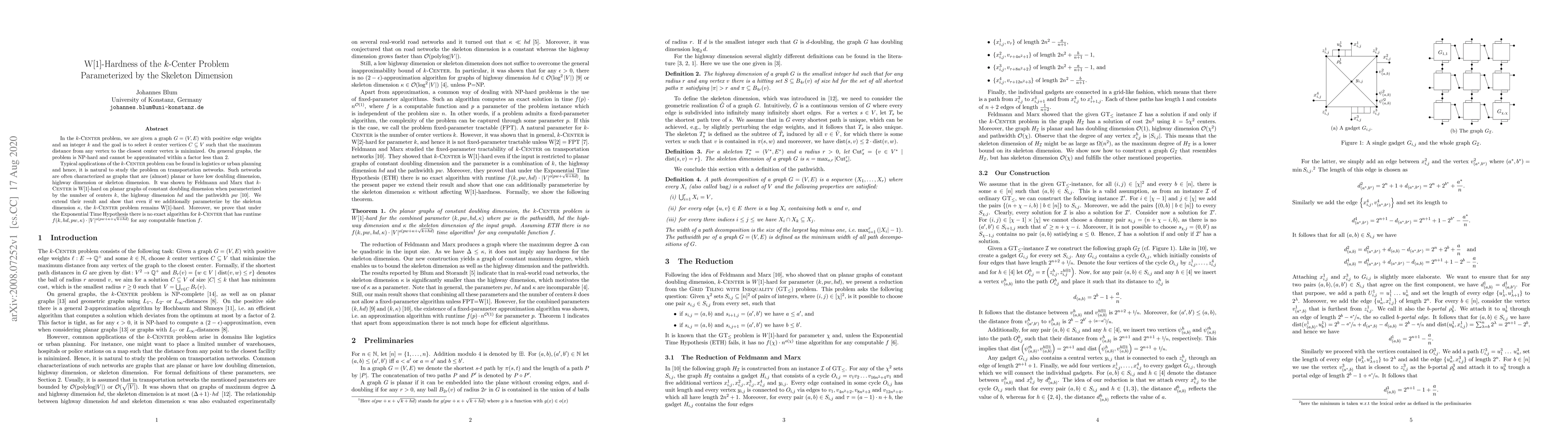 In the $k$-Center problem, we are given a graph $G=(V,E)$ with positive edge weights and an integer $k$ and the goal is to select $k$ center vertices $C \subseteq V$ such that the maximum distance from any vertex to the closest center vertex is minimized. On general graphs, the problem is NP-hard and cannot be approximated within a factor less than $2$. Typical applications of the $k$-Center problem can be found in logistics or urban planning and hence, it is natural to study the problem on transportation networks. Such networks are often characterized as graphs that are (almost) planar or have low doubling dimension, highway dimension or skeleton dimension. It was shown by Feldmann and Marx that $k$-Center is W[1]-hard on planar graphs of constant doubling dimension when parameterized by the number of centers $k$, the highway dimension $hd$ and the pathwidth $pw$. We extend their result and show that even if we additionally parameterize by the skeleton dimension $\kappa$, the $k$-Center problem remains W[1]-hard. Moreover, we prove that under the Exponential Time Hypothesis there is no exact algorithm for $k$-Center that has runtime $f(k,hd,pw,\kappa) \cdot \vert V \vert^{o(pw + \kappa + \sqrt{k+hd})}$ for any computable function $f$.