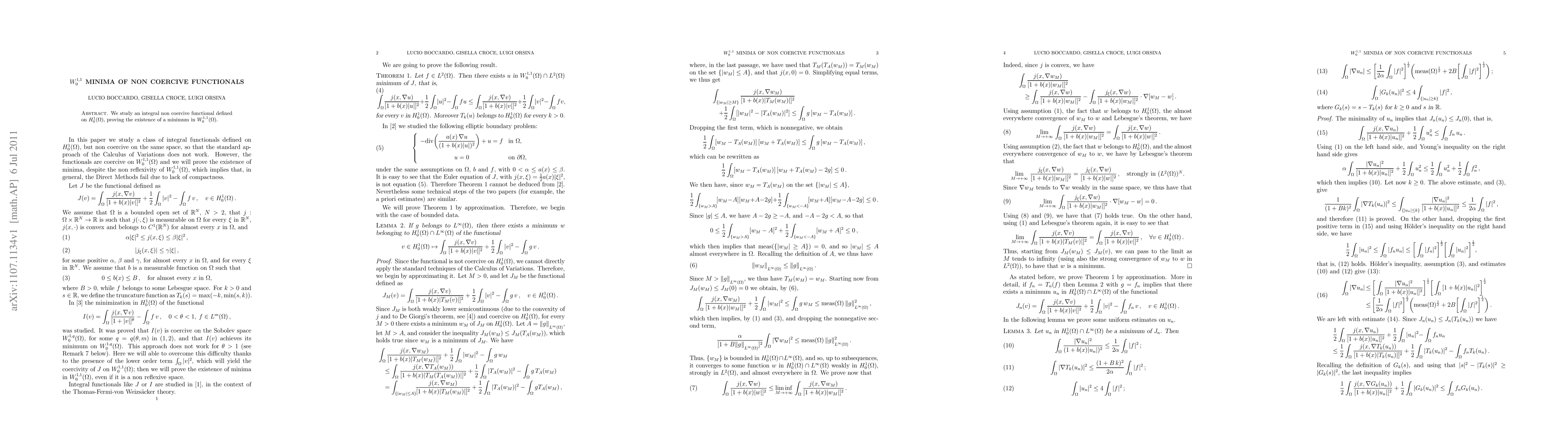Summary: This paper investigates an integral functional on the Sobolev space H^1_0, demonstrating the existence of a minimum within the space W^{1,1}_0 despite the functional being non coercive.