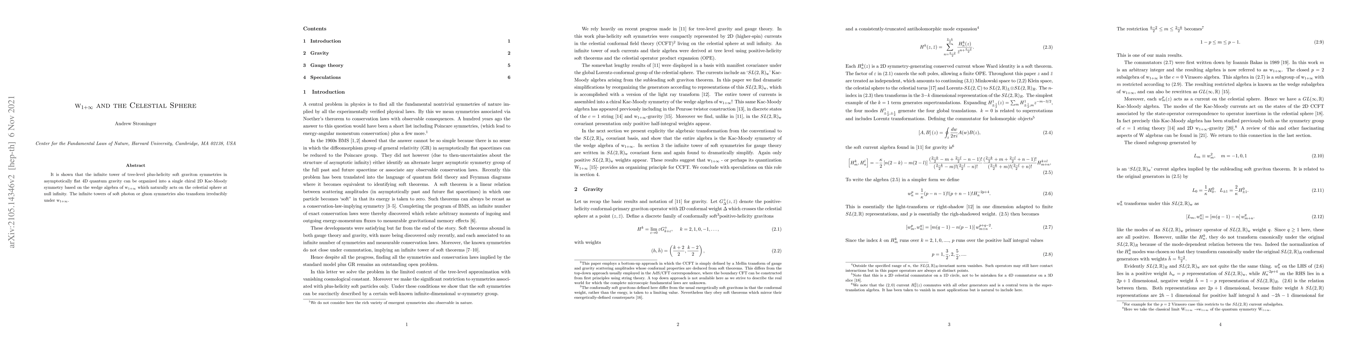This paper demonstrates that the infinite tower of soft graviton symmetries in 4D quantum gravity can be unified into a single chiral 2D Kac-Moody symmetry based on the w(1+infinity) wedge algebra, with similar transformations observed for soft photons and gluons.