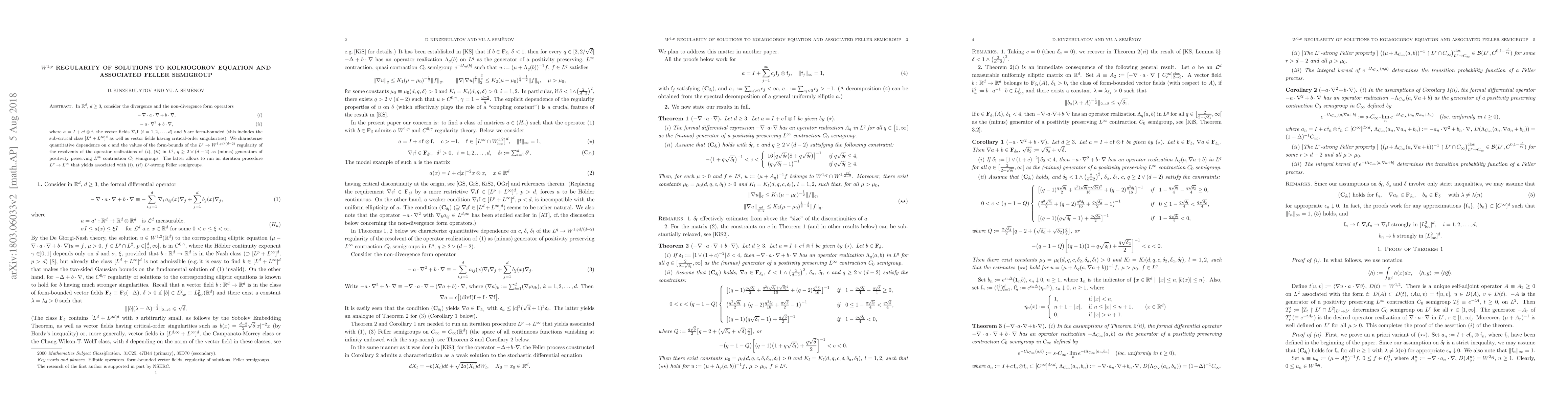 This research paper investigates the $W^{1,p}$ regularity of solutions to Kolmogorov equations and associated Feller semigroups, finding that certain operators yield positivity preserving contraction C_0 semigroups with quantitative dependence on parameters c and form-bounds.