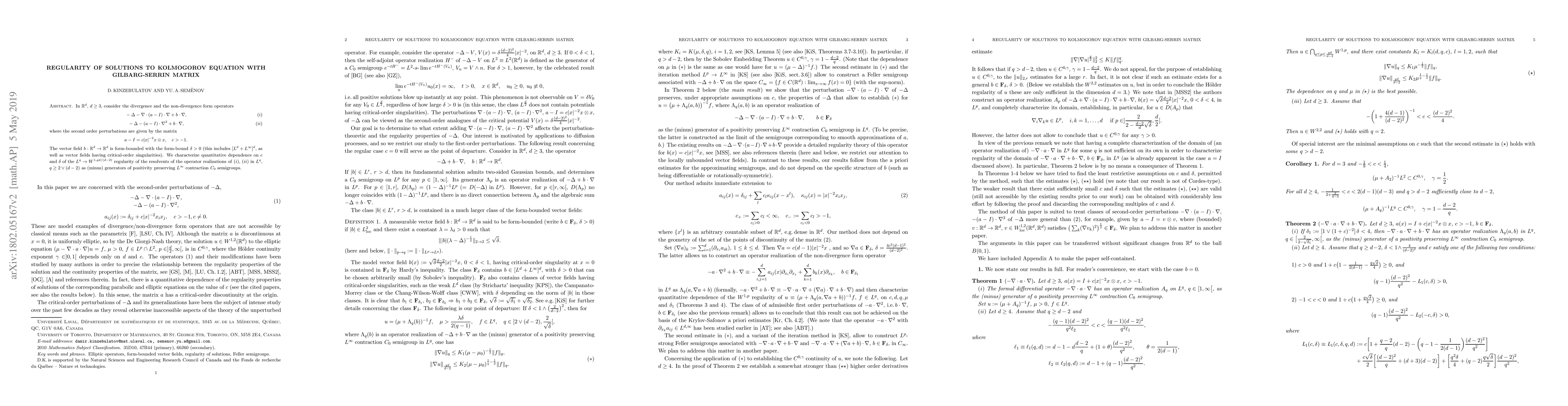 This paper investigates the $W^{1,p}$ regularity of solutions to the Kolmogorov equation with Gilbarg-Serrin matrix for divergence and non-divergence form operators in $b R^d$, $d geq 3$. It characterizes quantitative dependence on $c$ and $eta$ of the operator's resolvents' regularity.