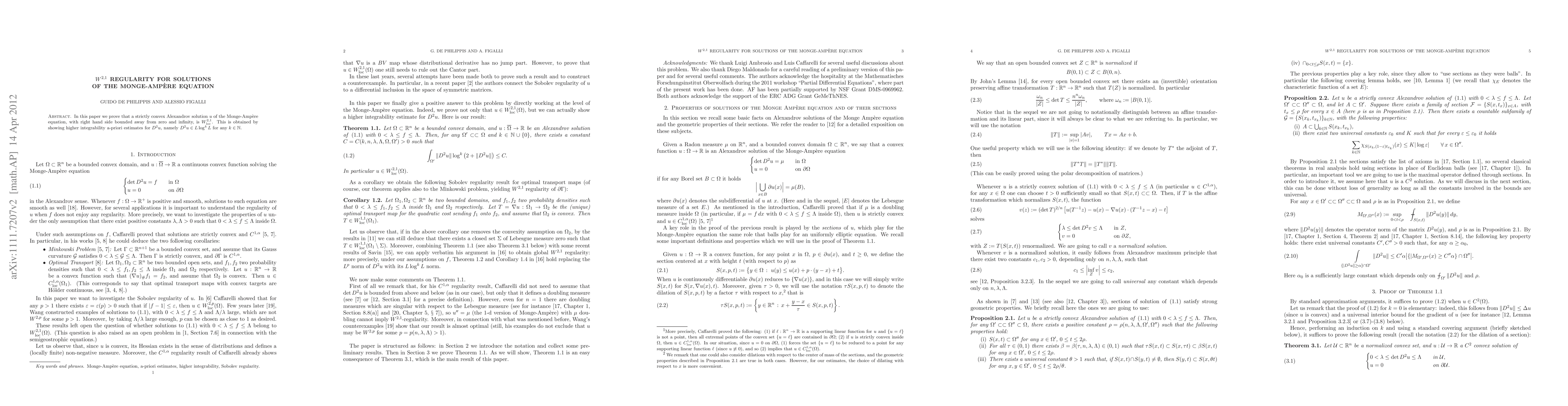 In this paper we prove that a strictly convex Alexandrov solution u of the Monge-Amp\`ere equation, with right hand side bounded away from zero and infinity, is $W_{\rm loc}^{2,1}$. This is obtained by showing higher integrability a-priori estimates for $D^2 u$, namely $D^2 u \in L\log^k L$ for any $k\in \mathbb N$.
