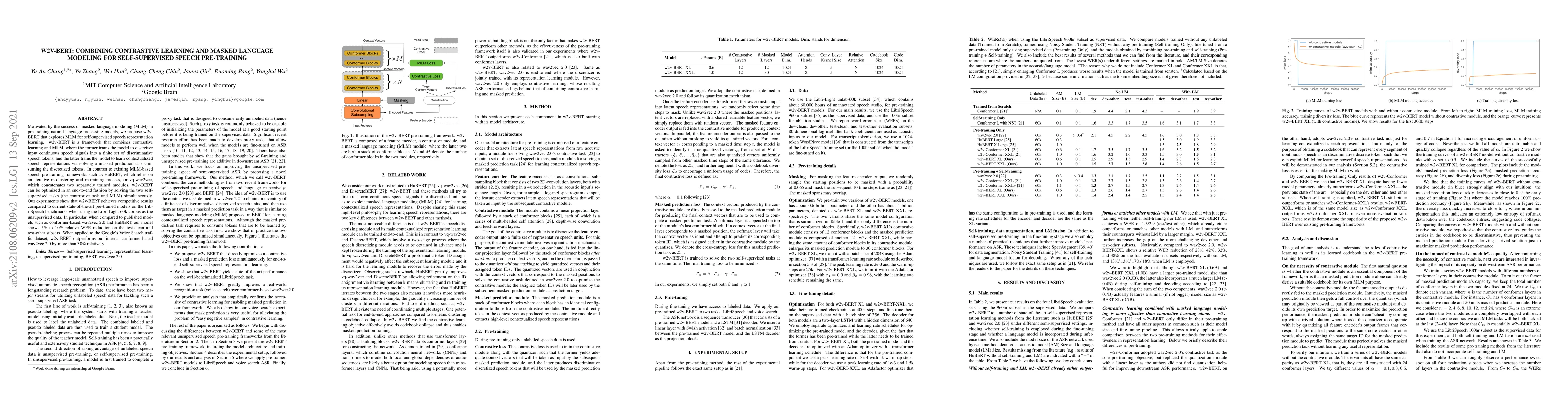 w2v-BERT combines contrastive learning and masked language modeling for self-supervised speech pre-training, achieving competitive results on LibriSpeech benchmarks and significant improvements in word error rates compared to existing models. The framework optimizes both tasks end-to-end, outperforming conformer-based wav2vec 2.0 and HuBERT on various datasets.
