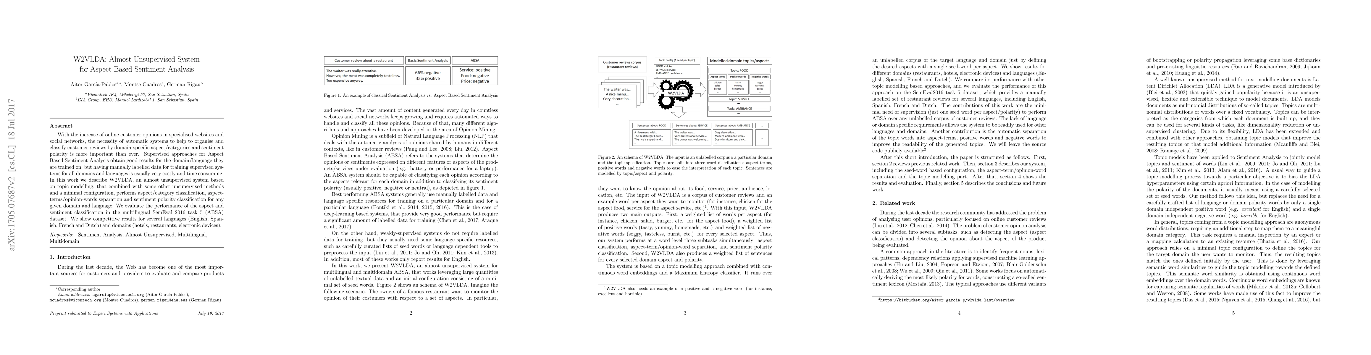 W2VLDA is an almost unsupervised system for Aspect Based Sentiment Analysis that leverages topic modelling and minimal configuration to classify customer reviews by domain-specific aspects and sentiment polarity. It demonstrates competitive performance across multiple languages and domains in the SemEval 2016 ABSA dataset.