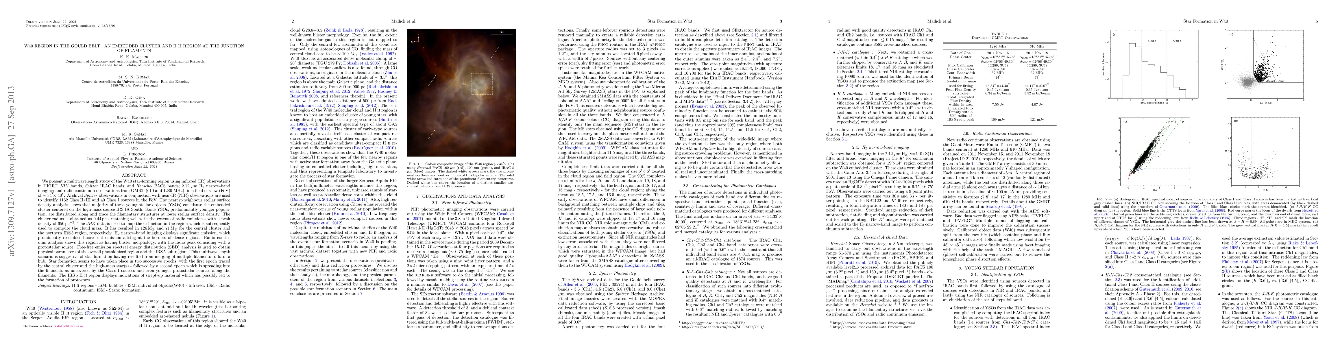 We present a multiwavelength study of W40 star-forming region using IR observations in UKIRT JHK bands, Spitzer IRAC bands & Herschel PACS bands; 2.12 micron H2 narrow-band imaging; & radio observations from GMRT (610 & 1280 MHz), in a FoV of ~34'x40'. Spitzer observations along with NIR observations are used to identify 1162 Class II/III & 40 Class I sources in the FoV. The NN stellar surface density analysis shows that majority of these YSOs constitute the embedded cluster centered on the source IRS1A South. Some YSOs, predominantly younger population, are distributed along & trace the filamentary structures at lower stellar surface density. The cluster radius is obtained as 0.44pc - matching well with the extent of radio emission - with a peak density of 650pc^-2. The JHK data is used to map the extinction which is subsequently used to compute the cloud mass. It has resulted in 126 Msun & 71 Msun for the central cluster & the northern IRS5 region, respectively. H2 narrow-band imaging displays significant emission, which prominently resembles fluorescent emission arising at the borders of dense regions. Radio analysis shows this region as having blister morphology, with the radio peak coinciding with a protostellar source. Free-free emission SED analysis is used to obtain physical parameters of the overall region & the IRS5 sub-region. This multiwavelength scenario is suggestive of star formation having resulted from merging of multiple filaments to form a hub. Star formation seems to have taken place in two successive epochs, with the first epoch traced by the central cluster & the high-mass star(s) - followed by a second epoch which is spreading into the filaments as uncovered by the Class I sources & even younger protostellar sources along the filaments. The IRS5 HII region displays indications of swept-up material which has possibly led to the formation of protostars.