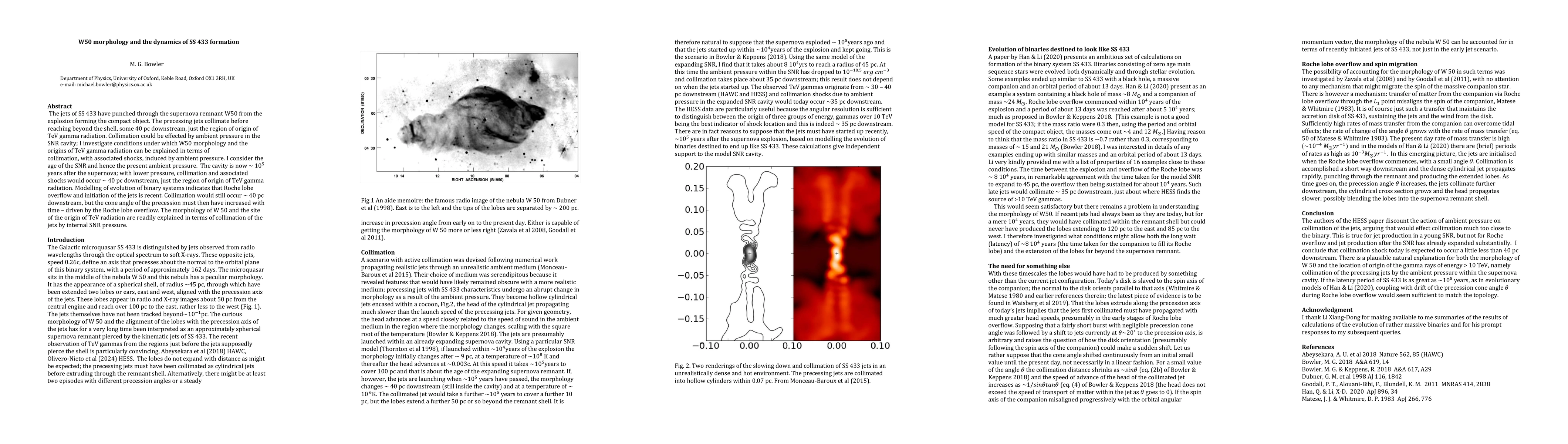 This paper investigates how the morphology of W50 and the origins of TeV gamma radiation in SS 433 can be explained by the collimation of precessing jets by ambient pressure within the supernova remnant (SNR). It concludes that the jets' collimation, and thus the location of TeV gamma radiation, are driven by the SNR's internal pressure, with the cone angle evolving due to Roche lobe overflow.