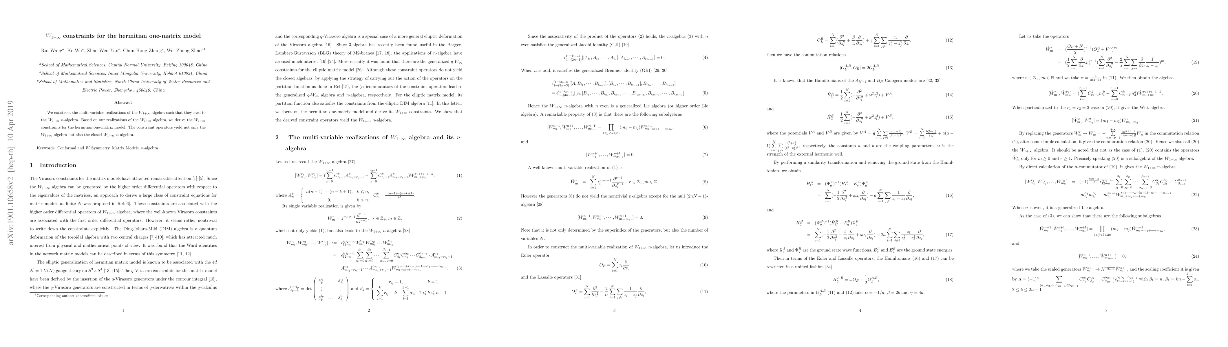 This paper constructs multi-variable realizations of the $W_{1+\infty}$ algebra leading to the $W_{1+\infty}$ $n$-algebra and derives $W_{1+\infty}$ constraints for the hermitian one-matrix model, which generate both the $W_{1+\infty}$ algebra and its closed $n$-algebra.