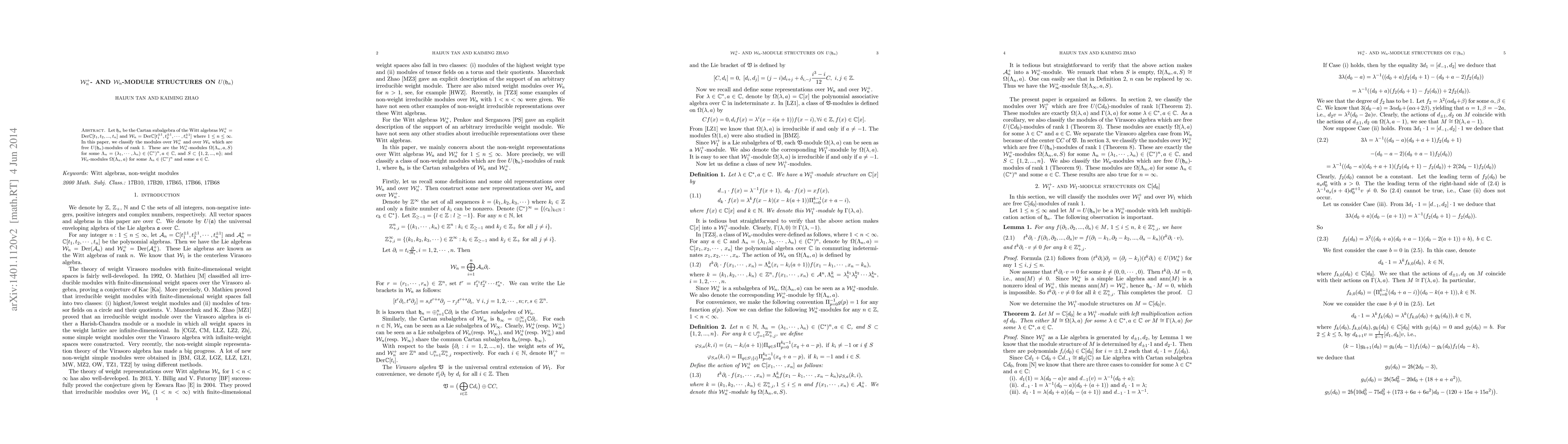 Research paper classifies module structures over Witt algebras, specifically focusing on free U-halo algebras of rank 1 for both + and -module structures.