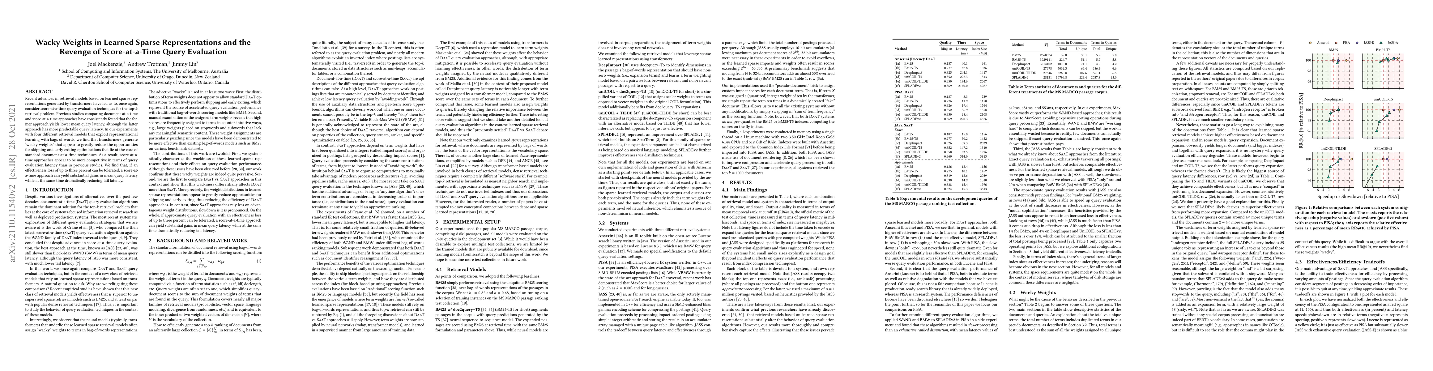 Recent advances in retrieval models based on learned sparse representations generated by transformers have led us to, once again, consider score-at-a-time query evaluation techniques for the top-k retrieval problem. Previous studies comparing document-at-a-time and score-at-a-time approaches have consistently found that the former approach yields lower mean query latency, although the latter approach has more predictable query latency. In our experiments with four different retrieval models that exploit representational learning with bags of words, we find that transformers generate "wacky weights" that appear to greatly reduce the opportunities for skipping and early exiting optimizations that lie at the core of standard document-at-a-time techniques. As a result, score-at-a-time approaches appear to be more competitive in terms of query evaluation latency than in previous studies. We find that, if an effectiveness loss of up to three percent can be tolerated, a score-at-a-time approach can yield substantial gains in mean query latency while at the same time dramatically reducing tail latency.