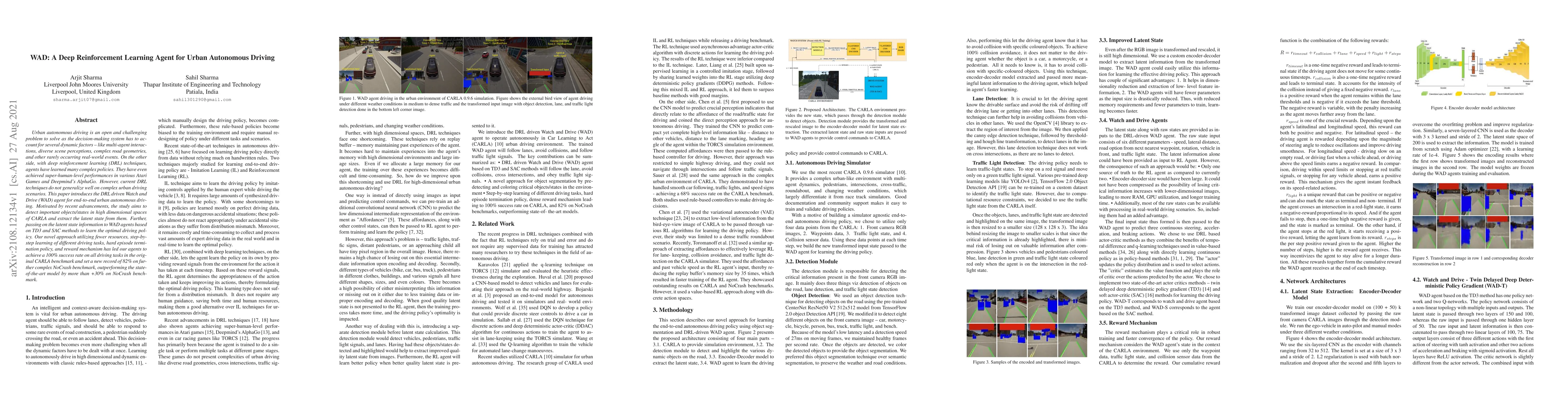 Urban autonomous driving is an open and challenging problem to solve as the decision-making system has to account for several dynamic factors like multi-agent interactions, diverse scene perceptions, complex road geometries, and other rarely occurring real-world events. On the other side, with deep reinforcement learning (DRL) techniques, agents have learned many complex policies. They have even achieved super-human-level performances in various Atari Games and Deepmind's AlphaGo. However, current DRL techniques do not generalize well on complex urban driving scenarios. This paper introduces the DRL driven Watch and Drive (WAD) agent for end-to-end urban autonomous driving. Motivated by recent advancements, the study aims to detect important objects/states in high dimensional spaces of CARLA and extract the latent state from them. Further, passing on the latent state information to WAD agents based on TD3 and SAC methods to learn the optimal driving policy. Our novel approach utilizing fewer resources, step-by-step learning of different driving tasks, hard episode termination policy, and reward mechanism has led our agents to achieve a 100% success rate on all driving tasks in the original CARLA benchmark and set a new record of 82% on further complex NoCrash benchmark, outperforming the state-of-the-art model by more than +30% on NoCrash benchmark.