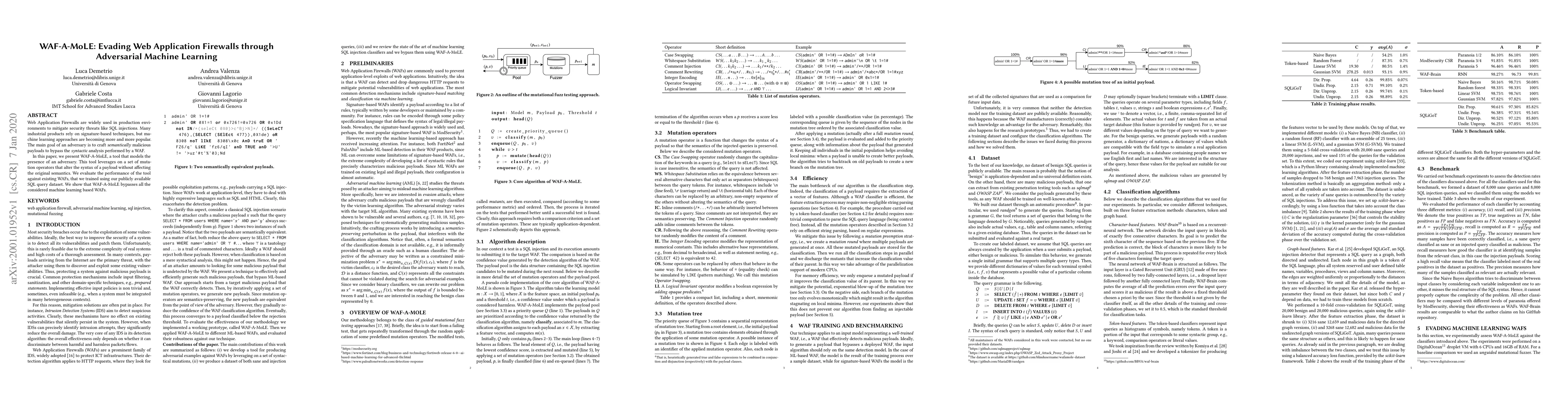 This paper introduces WAF-A-MoLE, a tool that employs adversarial machine learning to evade Web Application Firewalls (WAFs) by generating syntactically altered but semantically unchanged malicious payloads. The tool successfully bypasses machine learning-based WAFs, demonstrating its effectiveness against existing defenses.