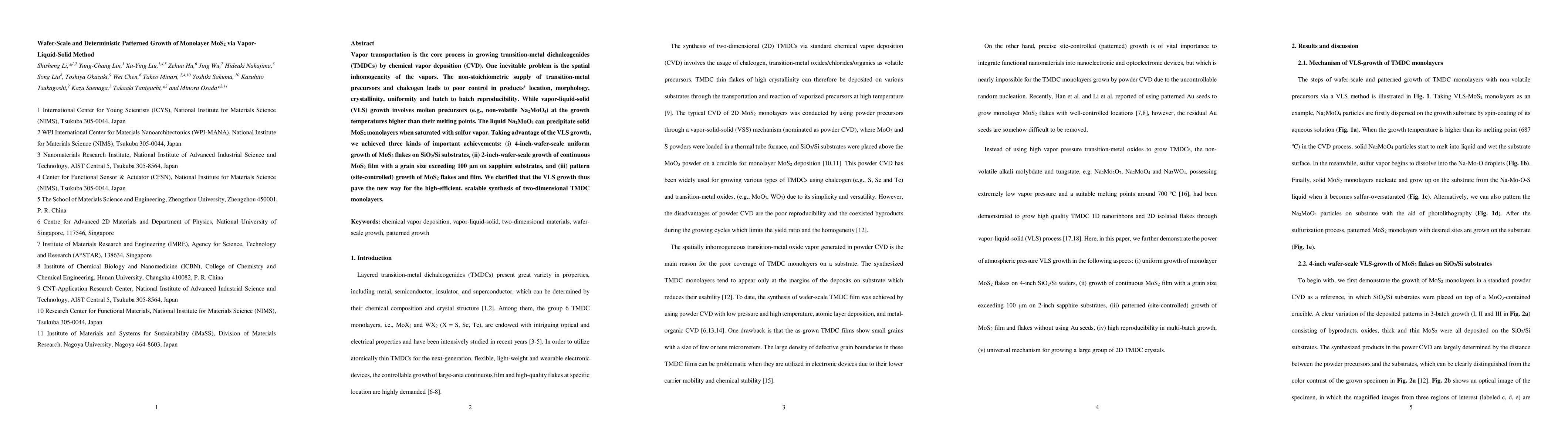 This paper reports the wafer-scale and deterministic growth of monolayer MoS2 using the vapor-liquid-solid (VLS) method, achieving uniform 4-inch flakes and continuous films with controlled patterns, thus offering a scalable synthesis route for two-dimensional transition-metal dichalcogenides.