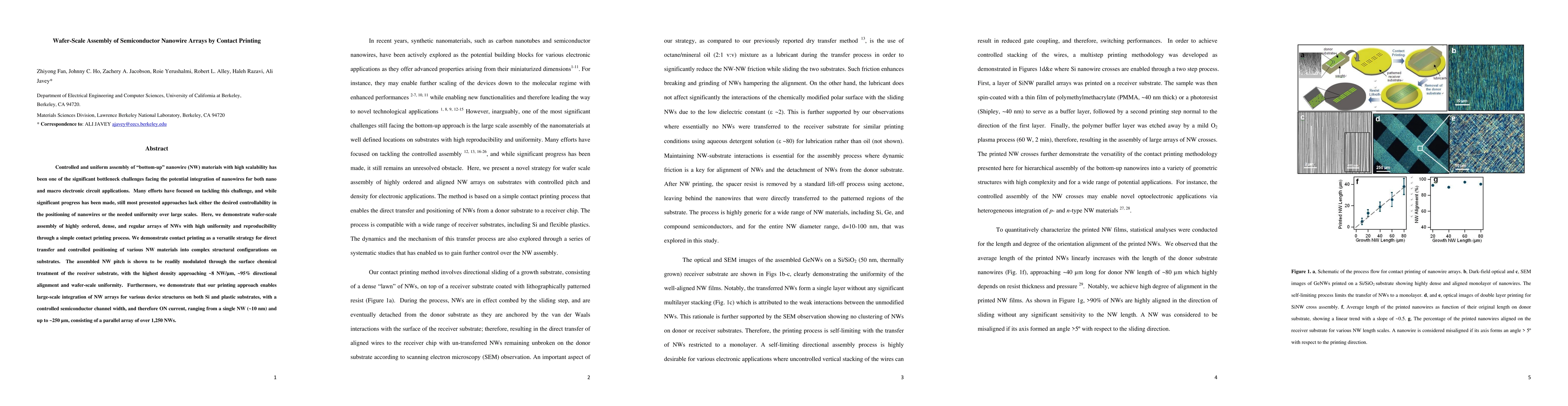 This paper presents a method for wafer-scale assembly of highly ordered semiconductor nanowire arrays using contact printing, achieving uniform and reproducible large-scale integration with controlled positioning and alignment. The technique allows for modulation of nanowire pitch and enables integration of nanowire arrays in various device structures on different substrates.