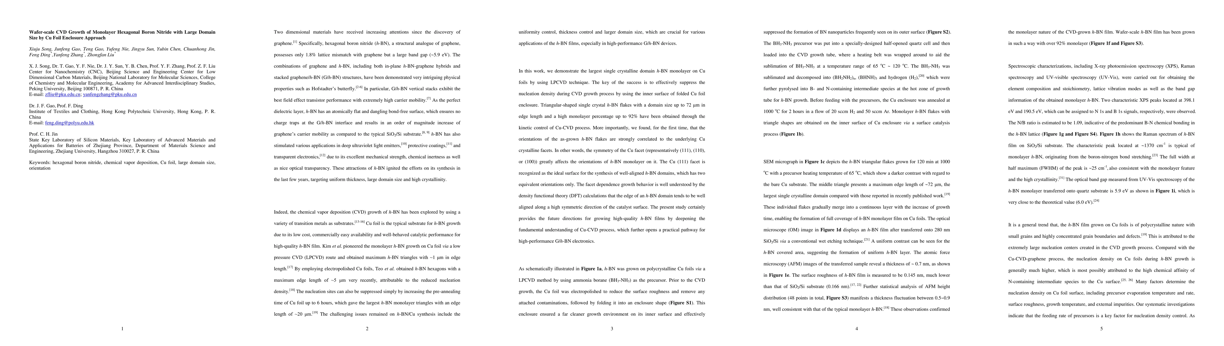This paper reports the successful wafer-scale growth of high-quality monolayer hexagonal boron nitride (h-BN) using a Cu foil enclosure approach, achieving single crystalline domains up to 72 micrometers. The method effectively reduces nucleation centers and suppresses hydrogen etching, revealing strong orientation correlation with Cu substrate facets.