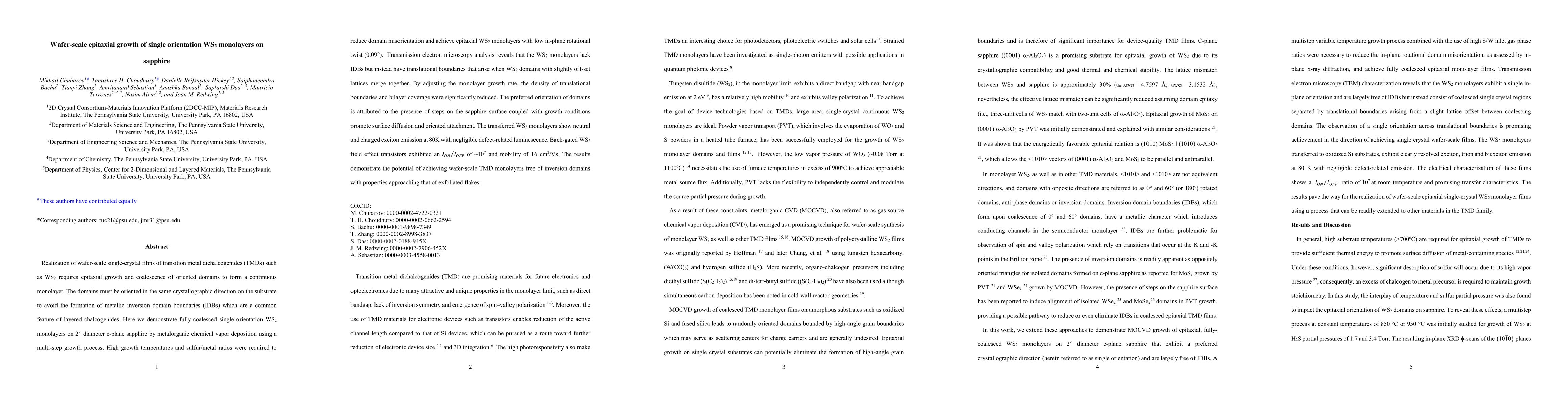 This paper demonstrates the successful wafer-scale epitaxial growth of single orientation WS2 monolayers on sapphire using a multi-step metalorganic chemical vapor deposition process. The monolayers exhibit low in-plane rotational twist and lack inversion domain boundaries, showing potential for high-performance electronic applications.