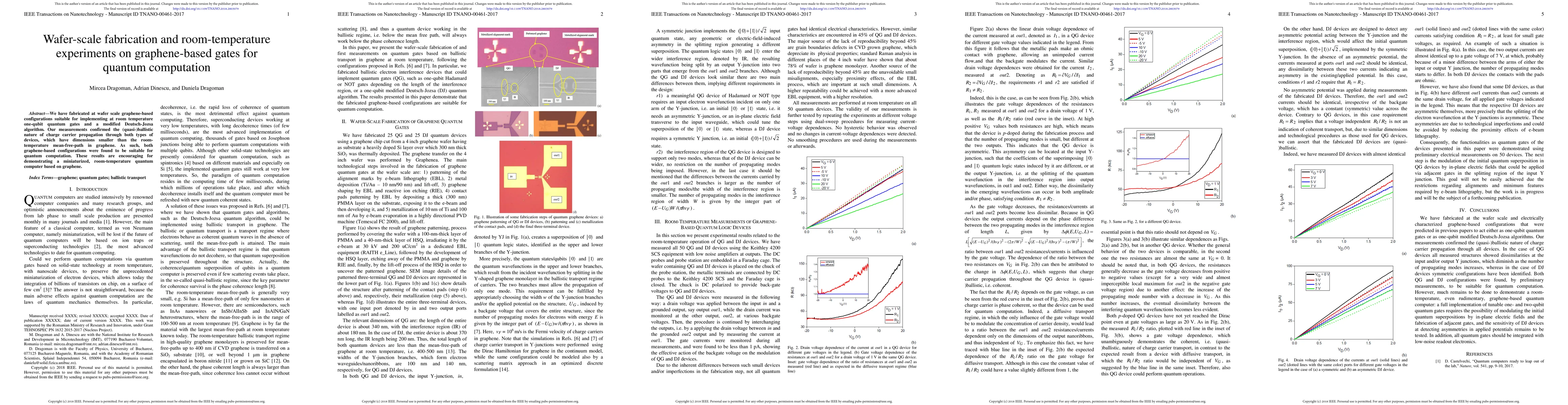 This paper details the wafer-scale fabrication of graphene-based quantum gates and experiments confirming their suitability for room-temperature quantum computation, highlighting the quasi-ballistic charge propagation in these devices. The findings support the potential for a miniaturized quantum computer using graphene at room temperature.