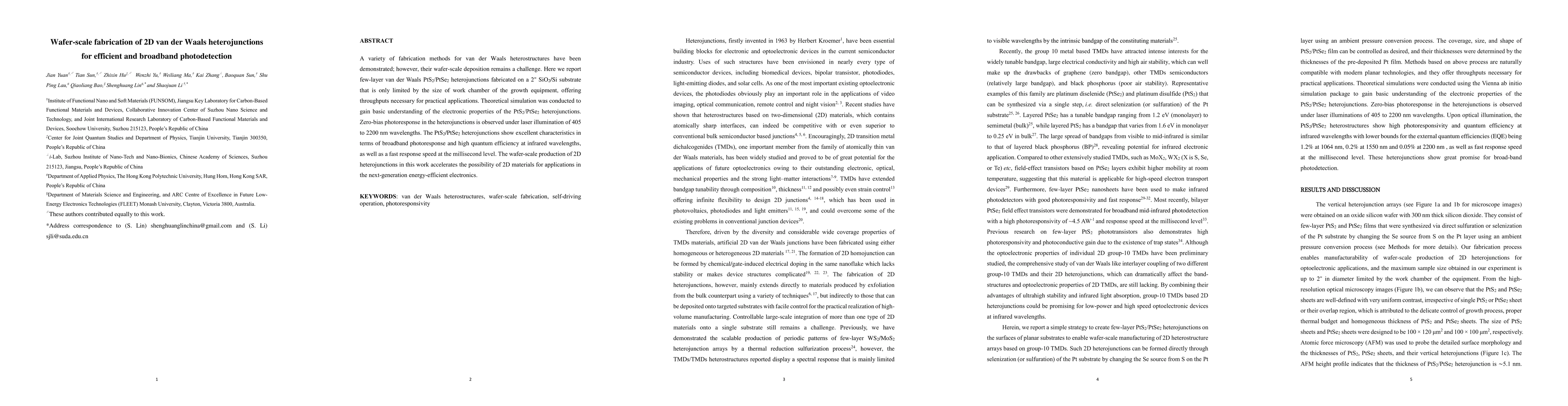 This paper reports the wafer-scale fabrication of PtS2/PtSe2 van der Waals heterojunction photodiodes, achieving efficient broadband photodetection with high responsivity and fast response times. The scalable production method opens pathways for practical applications in energy-efficient electronics.