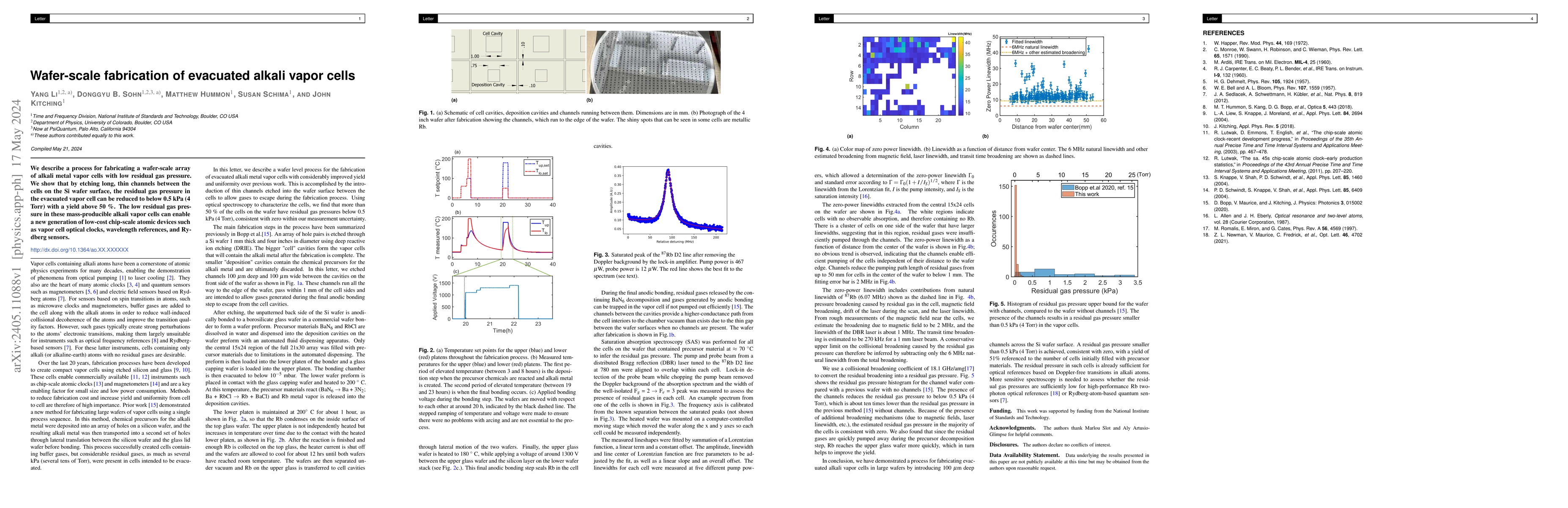 This paper details a method for creating wafer-scale arrays of low residual gas pressure alkali vapor cells through etching channels on a Si wafer, achieving pressures below 0.5 kPa and a yield over 50%. These low-pressure cells could facilitate the development of cost-effective, chip-scale atomic devices.
