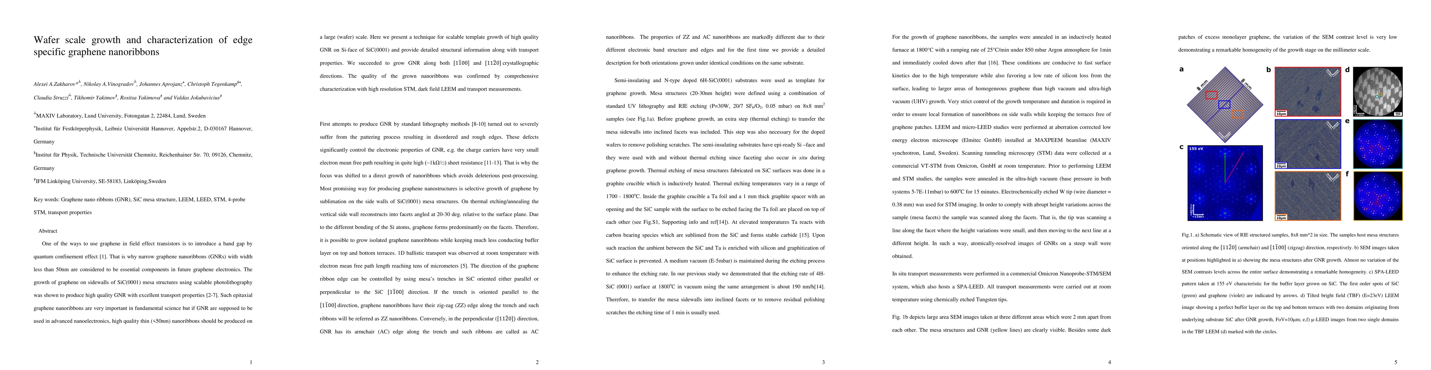 This paper presents a scalable technique for wafer-scale growth of high-quality graphene nanoribbons (GNRs) on the Si-face of SiC(0001) using template methods, and details their structural and transport properties, showing potential for future graphene electronics. Comprehensive characterization using STM, LEEM, and transport measurements confirms the quality of the GNRs along both [1-100] and [11-20] directions.