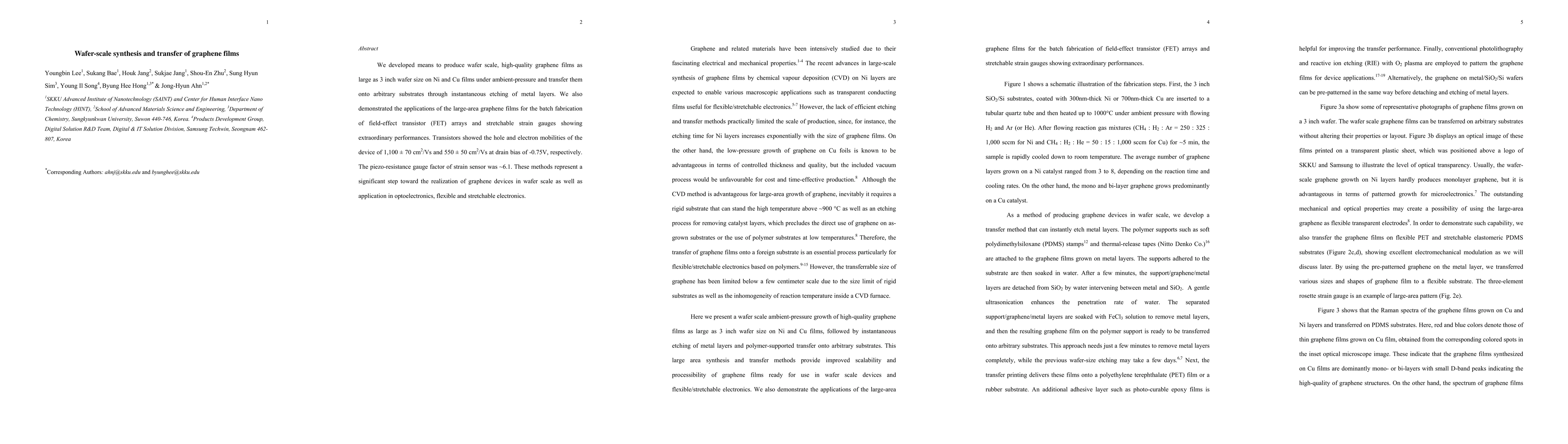 This paper presents a method for wafer-scale synthesis of high-quality graphene films on Ni and Cu substrates followed by their transfer onto various substrates through metal etching. Applications demonstrated include field-effect transistors and stretchable strain gauges with impressive performance metrics.