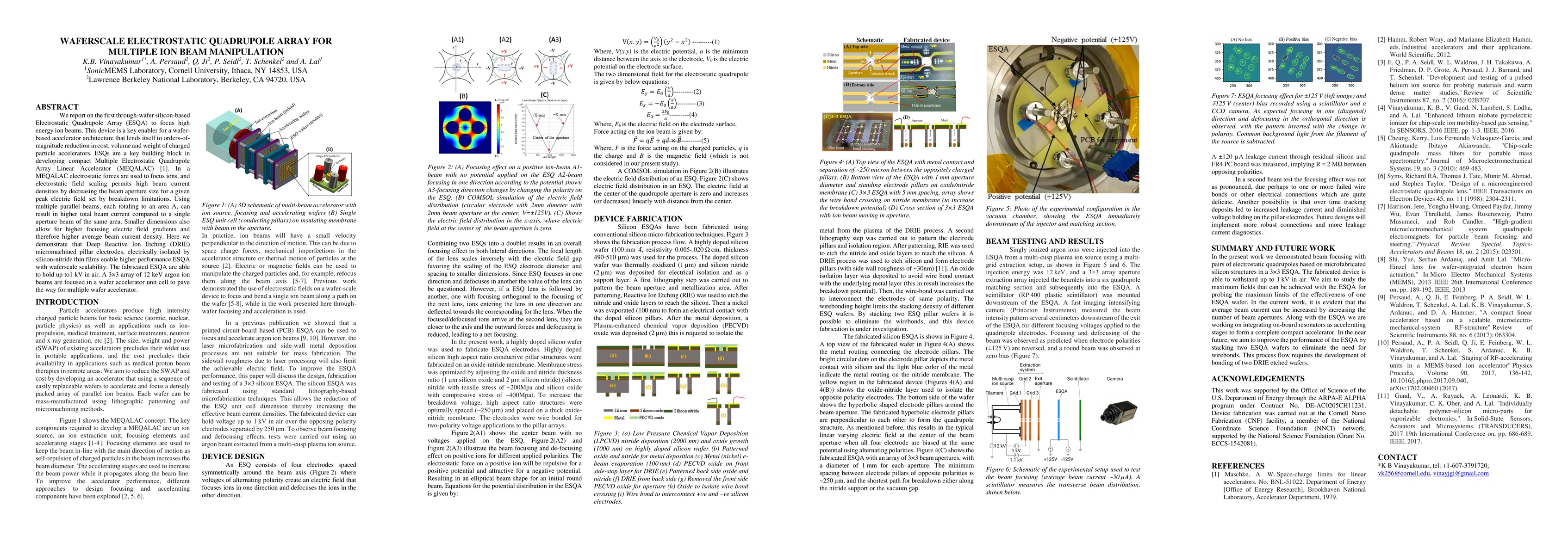 We report on the first through-wafer silicon-based Electrostatic Quadrupole Array (ESQA) to focus high energy ion beams. This device is a key enabler for a wafer based accelerator architecture that lends itself to orders-of-magnitude reduction in cost, volume and weight of charged particle accelerators. ESQs are a key building block in developing compact Multiple Electrostatic Quadrupole Array Linear Accelerator (MEQALAC) [1]. In a MEQALAC electrostatic forces are used to focus ions, and electrostatic field scaling permits high beam current densities by decreasing the beam aperture size for a given peak electric field set by breakdown limitations. Using multiple parallel beams, each totaling to an area A, can result in higher total beam current compared to a single aperture beam of the same area. Smaller dimensions also allow for higher focusing electric field gradients and therefore higher average beam current density. Here we demonstrate that Deep Reactive Ion Etching (DRIE) micromachined pillar electrodes, electrically isolated by silicon-nitride thin films enable higher performance ESQA with waferscale scalability. The fabricated ESQA are able to hold up to1 kV in air. A 3*3 array of 12 keV argon ion beams are focused in a wafer accelerator unit cell to pave the way for multiple wafer accelerator.